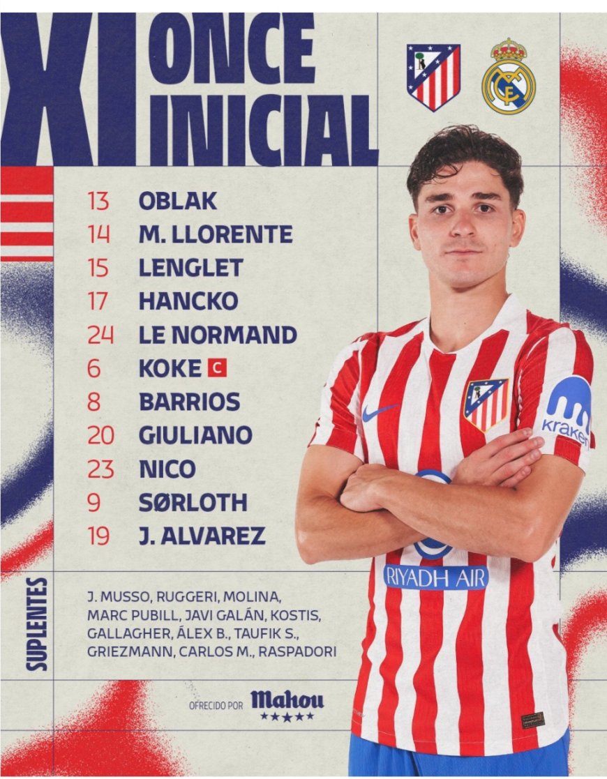 أعلن الأرجنتيني دييجو سيميوني، مدرب أتلتيكو مدريد، التشكيل الرسمي الذي سيخوض به مباراة الريال المقرر إقامتها فى الخامسة والربع مساء اليوم، السبت، على ملعب "طيران الرياض"، بالجولة السابعة من الدوري الإسباني.