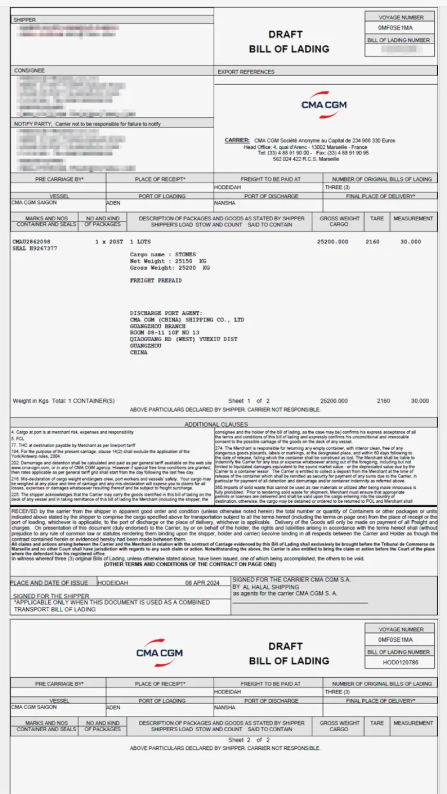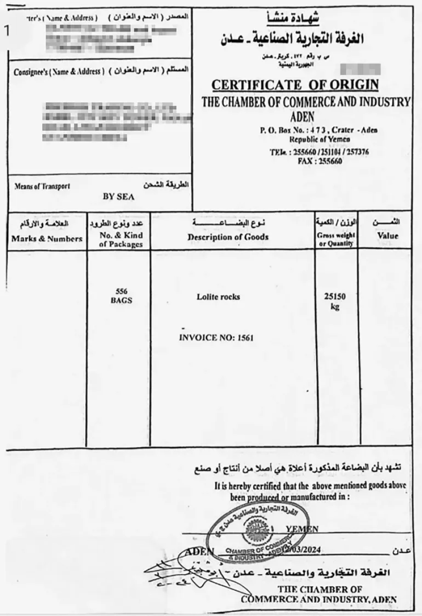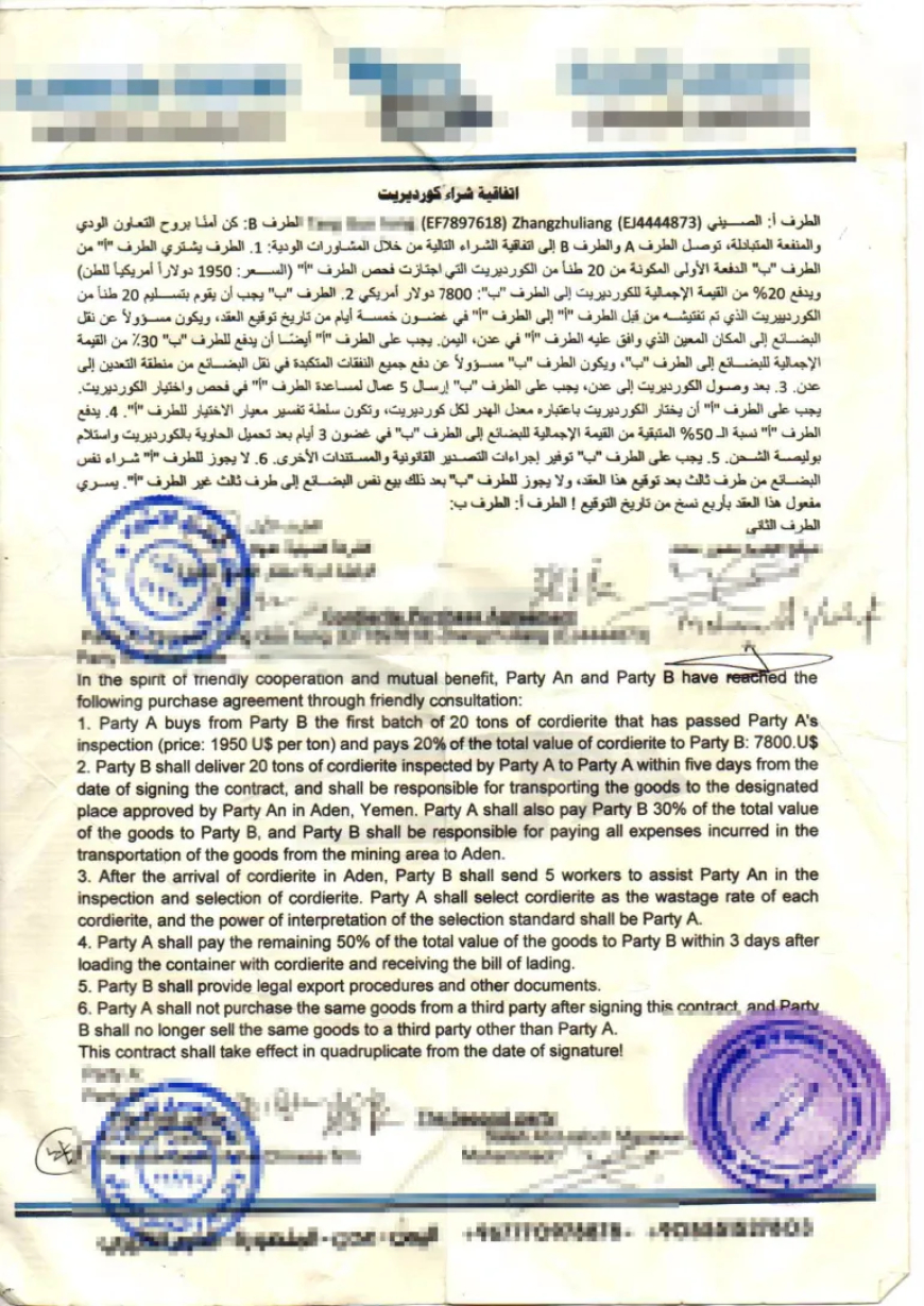 ولتأكيد الصورة، حصلت "الجزيرة نت" على نسخة من اتفاقية بيع وشراء أحجار كريمة (كورديريت) موقعة بين شركتين، إحداهما صينية والأخرى يمنية. مثّل الطرف الصيني شخص يُدعى م ع، بينما وقع عن الجانب اليمني ص ع. وبموجب الاتفاق، تم بيع 20 طنّا بسعر 1950 دولارا للطن.