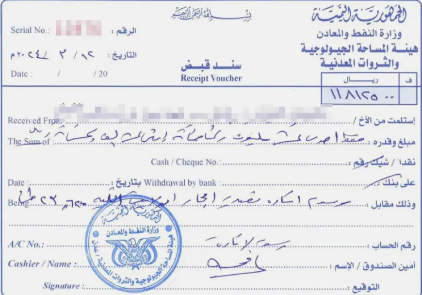 إيصال يوضح المبلغ المدفوع للحكومة كرسوم استخراج للأحجار الكريمة