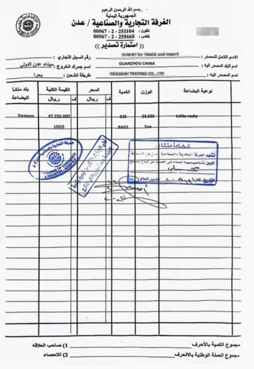 استمارة تصدير إلى الصين تظهر سعر الإيولايت بالريال اليمني