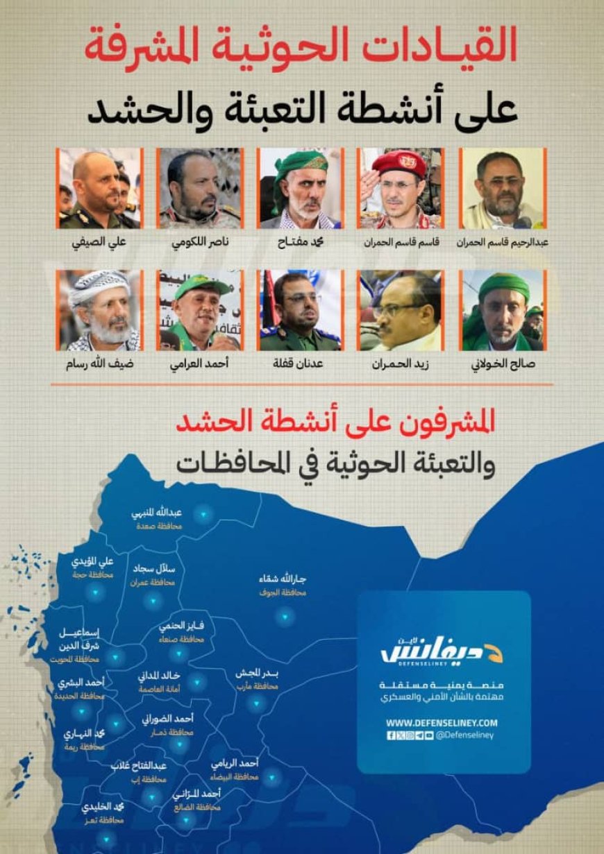 ويشارك القيادي حسين حسن محمد الحمران، في الإشراف على مراكز الحشد والدورات الأيدلوجية، كما تولى أيمن إسماعيل محمد أحمد الحيمي، مسئولية القيادة والسيطرة للحشد. وهو كان أحد أعضاء ما عرف بـ"خلية صنعاء الإرهابية" الحوثية التي جرى محاكمتهم خلال عامي 2006 و2007 بتهمة تشكيل عصابة مسلحة واستهداف الشخصيات والآليات العسكرية وسلسلة من التفجيرات.