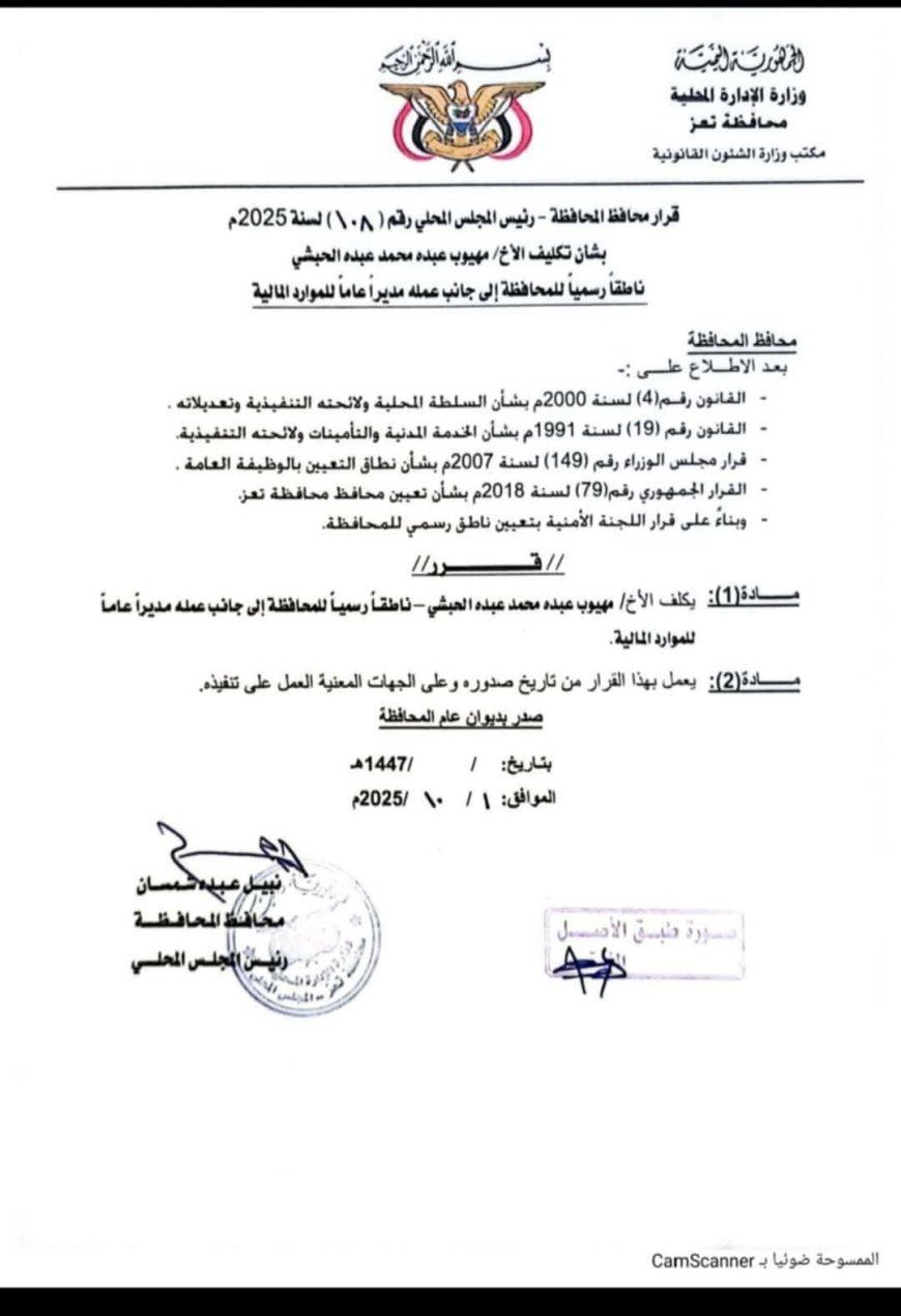 مادة 1يكلف الأخ مهيوب عبده محمد الحبشي ناطقاً رسمياً للمحافظة إلى جانب عملة مديراً لإدارة الموارد المالية.