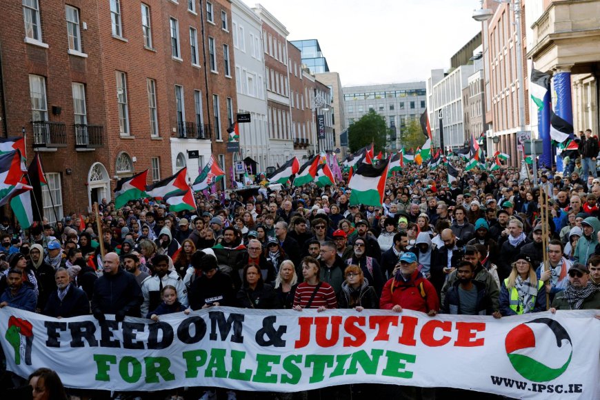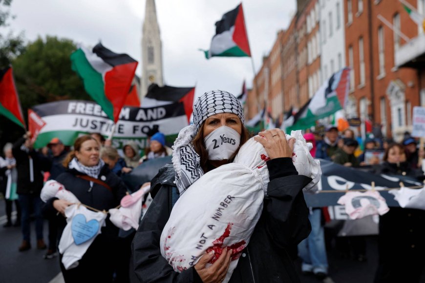 وفي دبلن، تظاهر آلاف الأشخاص أمام البرلمان لإحياء ذكرى مرور عامين على «الإبادة» في غزة.