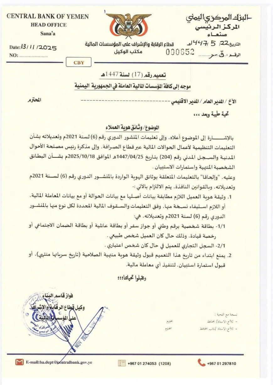 أصدر البنك المركزي في صنعاء، اليوم، تعميمًا مفاجئًا لكافة المؤسسات المالية يقضي بتشديد إجراءات التحقق من هوية العملاء قبل تنفيذ أي معاملة مالية أو حوالة.