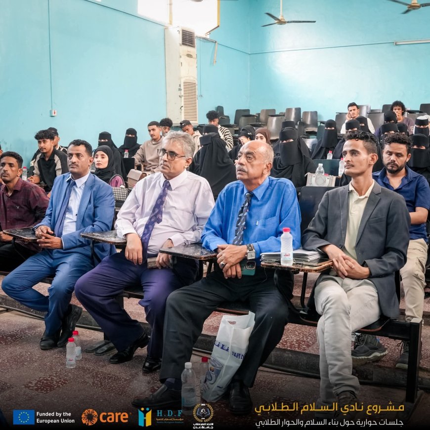 برعاية الأستاذ حامد أحمد لملس، وزير الدولة ومحافظ العاصمة عدن، والاستاذ الدكتور الخضر ناصر لصور، رئيس جامعة عدن ، نفذ الاتحاد العام لطلاب جامعة عدن بالشراكة مع مؤسسة إنسجام للتنمية جلسة حوارية حول بناء السلام والحوار الطلابي صباح اليوم الأحد الموافق 16 نوفمبر 2025م في رحاب كلية الاداب جامعة عدن ضمن مشروع نادي السلام الطلابي، بتمويل من الاتحاد الأوروبي ومنظمة كير العالمية .