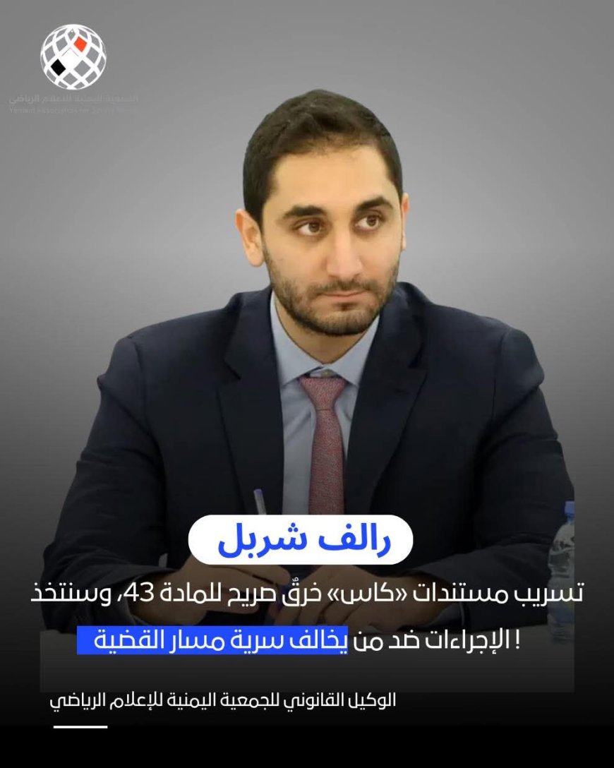 أعرب المحامي رالف شربل، الوكيل القانوني للجمعية اليمنية للإعلام الرياضي، عن أسفه وقلقه البالغ إزاء ما وصفه بـ"التسريب غير القانوني" لمستندات سرية تتعلق بقضية منظورة أمام محكمة التحكيم الرياضية الدولية (كاس) في لوزان.