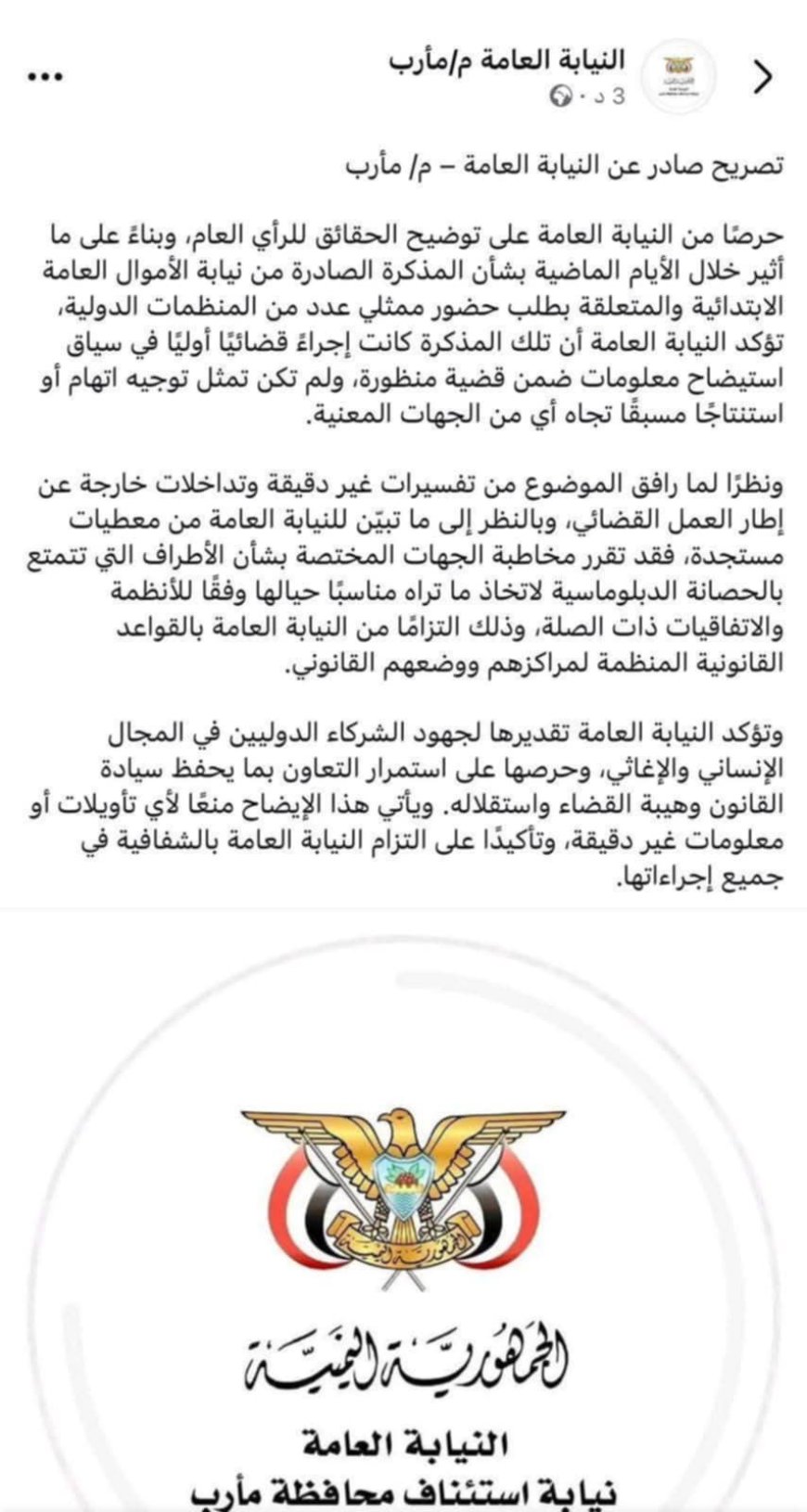 وأمام تصاعد الانتقادات، أصدرت النيابة العامة في مأرب توضيحًا ذكرت فيه أن الاستدعاءات تمت ضمن "قضية منظورة"، دون الإفصاح عن هوية رافع الدعوى، مؤكدة أن المنظمات الدولية تتمتع بـ"حصانة دبلوماسية"، وأن الإجراءات تطال فقط المنظمات المحلية.