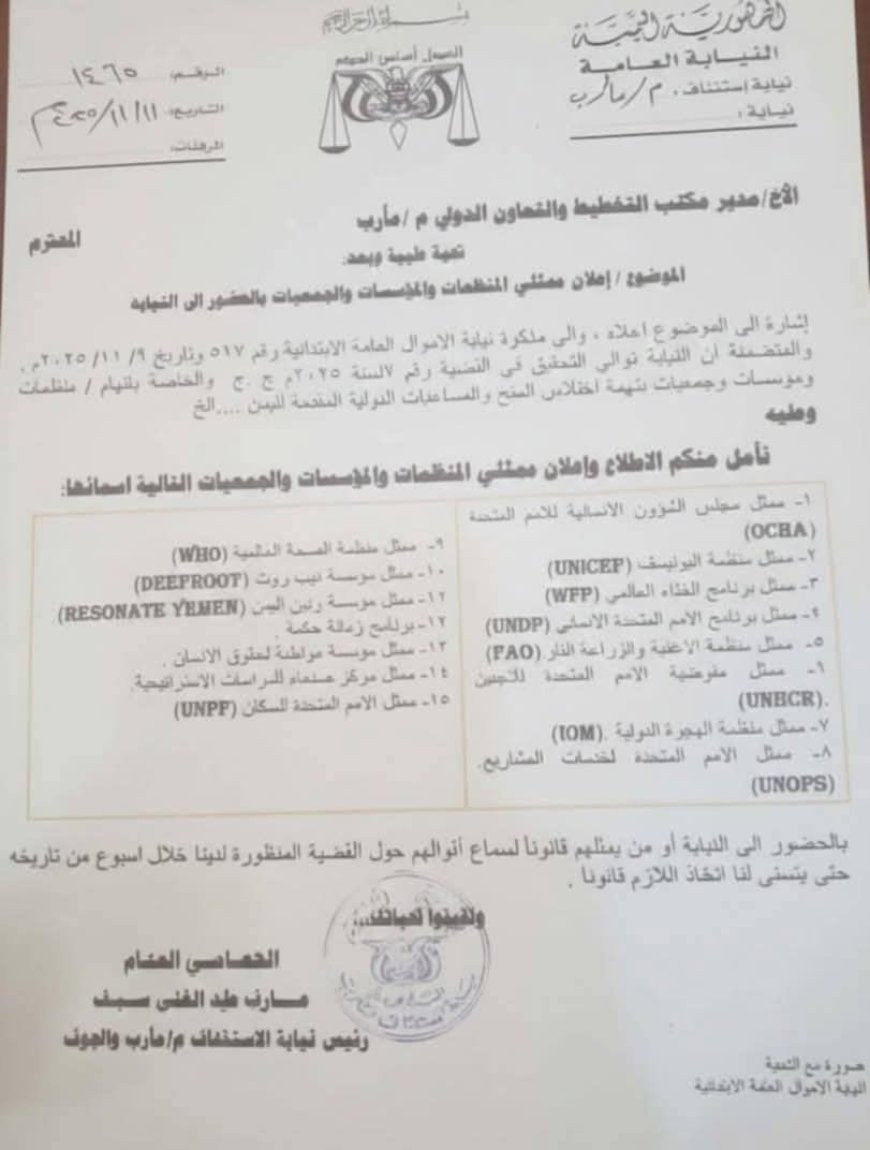 قضية غامضة ودعاوى بلا مُدّعٍ!!.. لماذا تستهدف نيابة مأرب المنظمات الدولية؟! (وثائق)
