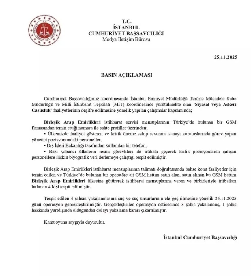 بيان صحفي: تم الكشف عن أنشطة تجسس سياسية أو عسكرية منسقة بين مكتب المدعي العام الجمهوري في إسطنبول وإدارة شرطة إسطنبول (فرع مكافحة الإرهاب) وجهاز المخابرات الوطني (MİT).