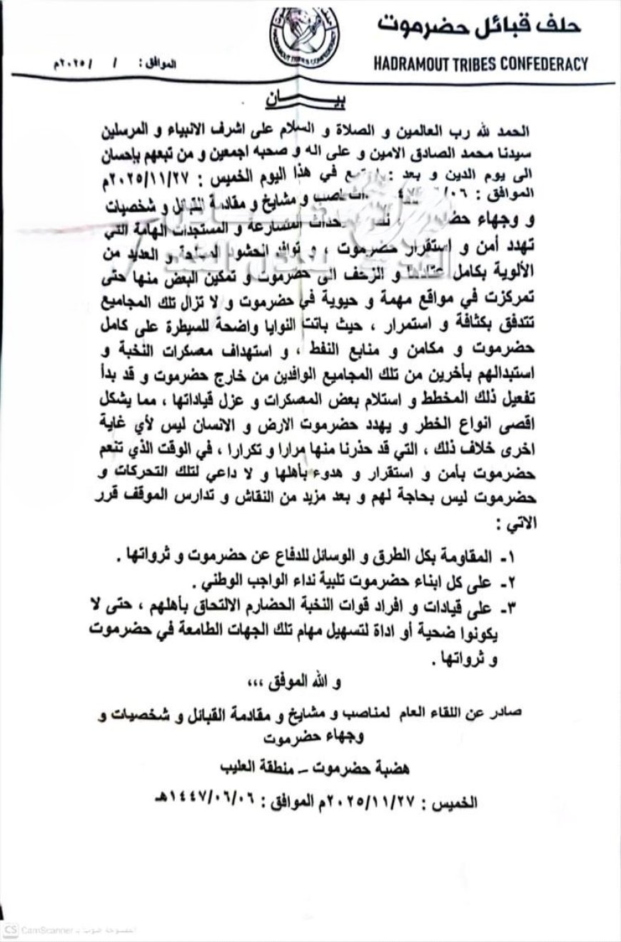 واختتم البيان بالتأكيد على أن المرحلة الراهنة تتطلب توحيد صف أبناء حضرموت لحماية أمن المحافظة وثرواتها ومنع أي محاولات لزعزعة استقرارها.