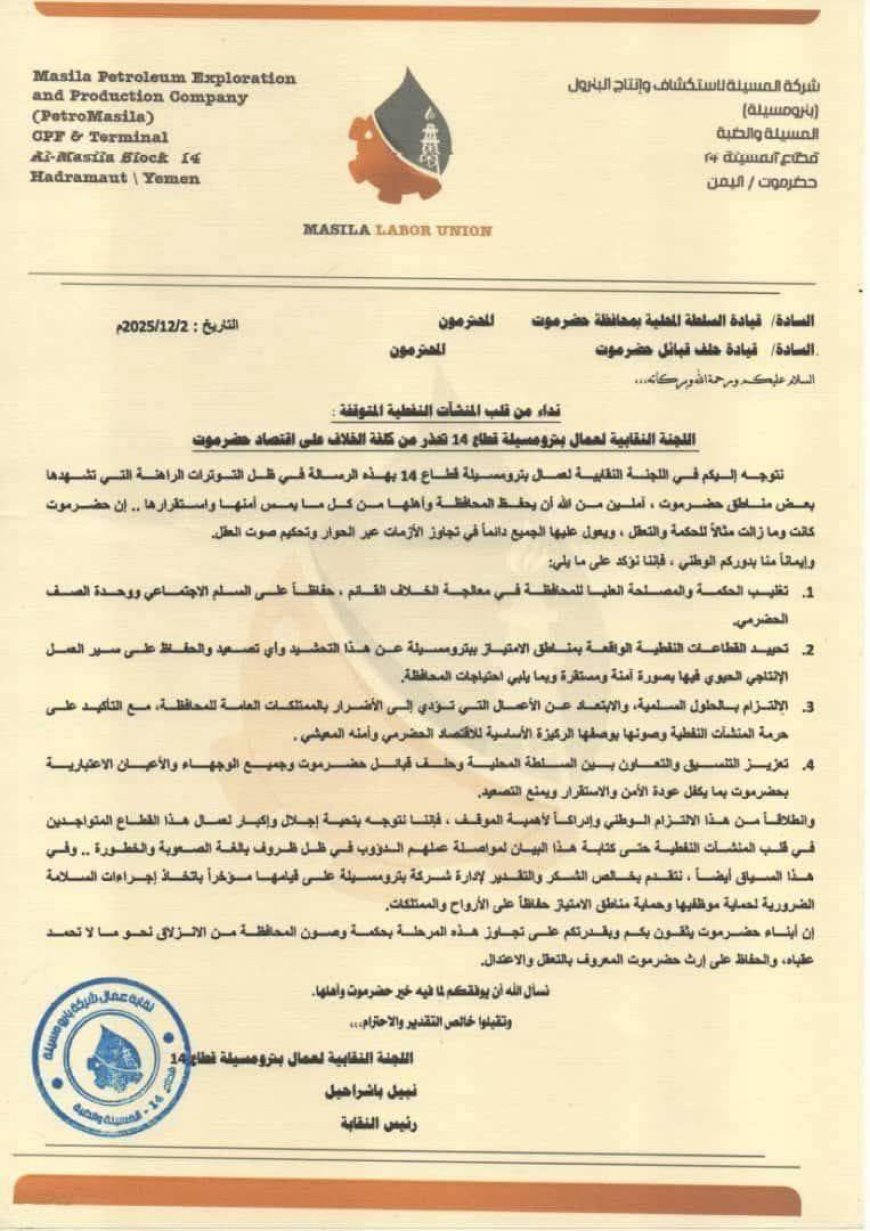 أطلقت اللجنة النقابية لعمال شركة "بترومسيلة" (Masila Labor Union) نداءً عاجلاً وتحذيراً شديد اللهجة موجهاً إلى قيادة محافظة حضرموت وحلف قبائل حضرموت، محذرةً من التداعيات الخطيرة للخلاف المستمر حول القطاع 14 على استقرار المحافظة واقتصادها الوطني.
