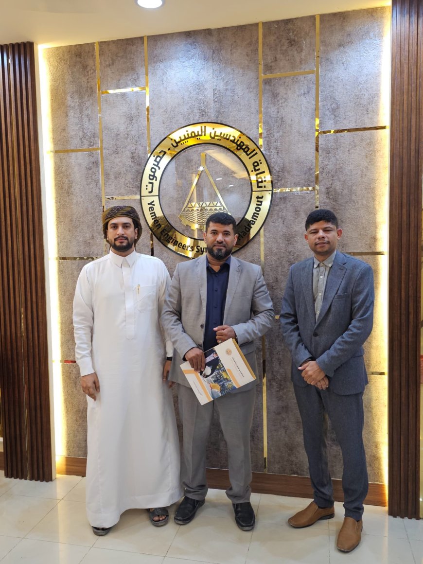 في إطار جهود نقابة المهندسين بمحافظة حضرموت لفتح آفاق جديدة أمام المهندسين لتأهيلهم وتعزيز حضورهم في سوق العمل، استقبل المهندس/ عمر مبروك مخيّر رئيس نقابة المهندسين، والمهندس/ جهاد لطفي بلفاس المسؤول المالي والإداري للنقابه، المهندس/ عمر القصيص مدير مصنع جبس دان التابع لشركة حضرموت الاهلية المحدودة للجبس. واثناء اللقى ناقش الطرفان آفاق الشراكة المستقبلية في مجالات التدريب والتأهيل، وسبل توفير فرص عمل للمهندسين داخل المصنع، بما يسهم في تمكين الكفاءات الهندسية وتعزيز دورها في القطاع الصناعي.