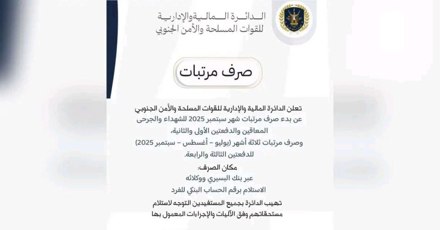 ويأتي هذا الإعلان تلبية للمطالبات الشعبية المتصاعدة بانتظام صرف الرواتب، ويُنتظر أن يُسهم في تخفيف الأعباء المعيشية عن آلاف الأسر في المحافظات الجنوبية التي عانت بشدة جراء توقف المستحقات لشهور عديدة.