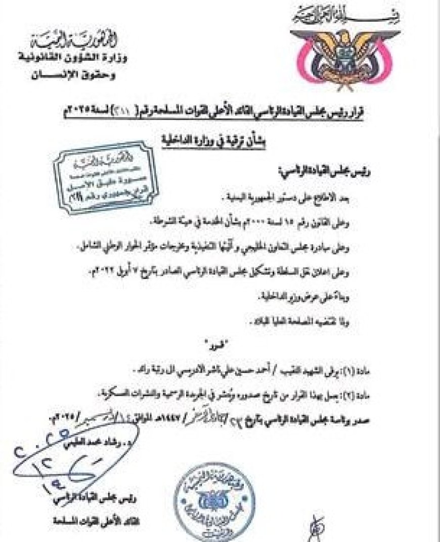 أصدر فخامة رئيس مجلس القيادة الرئاسي، الدكتور رشاد محمد العليمي، قراراً رئاسياً يقضي بمنح الشهيد البطل أحمد الإدريسي ترقية استثنائية إلى رتبة "رائد"، وذلك في خطوة تجسد تقدير الدولة لرموز الفداء والتضحية.