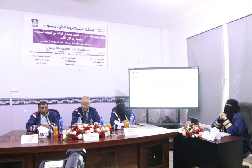 وذلك بعد مناقشة أطروحة الدكتوراه بعنوان ( *أثر منهج سيجما ستة Six Sigma كمتغير وسيط في العلاقة بين العملية التدريبية وتنمية رأس المال الفكري*)دراسة ميدانية في مؤسسات القطاع العام بمحافظة حضرموت والتي أقيمت بقاعة كلية العلوم والادارية جامعة عدن