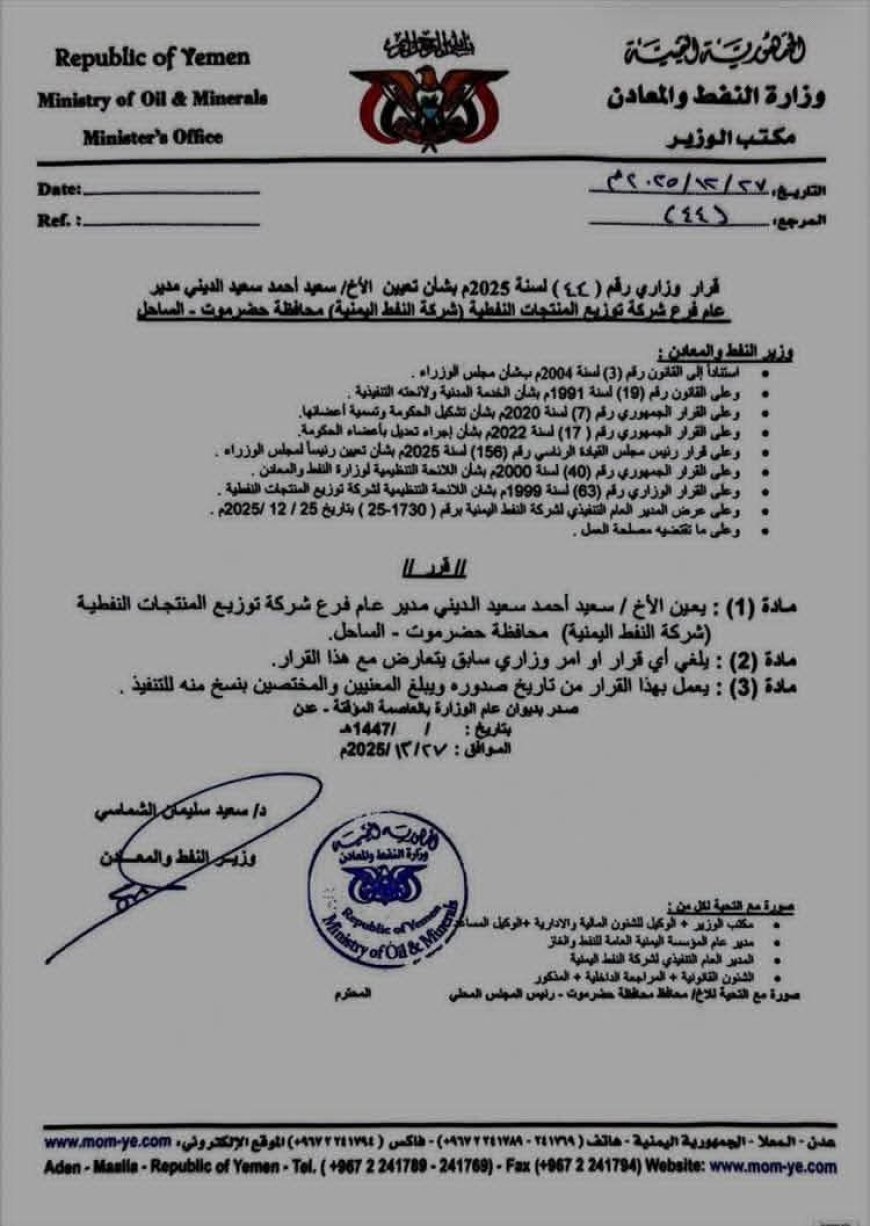 أصدر معالي وزير النفط والمعادن، الدكتور سعيد سليمان الشماسي، اليوم الأحد 28 ديسمبر 2025م، قراراً وزارياً رقم (44) لسنة 2025م، يقضي بتكليف قيادة جديدة لفرع شركة توزيع المنتجات النفطية (شركة النفط اليمنية) في محافظة حضرموت - الساحل.