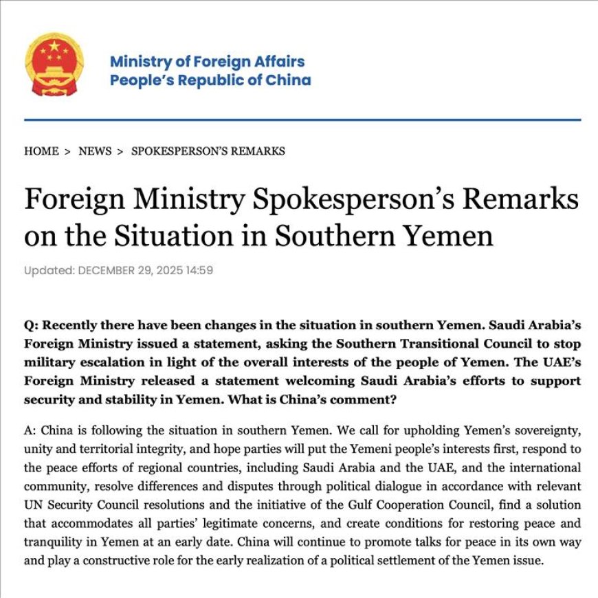 في تطور دبلوماسي دولي بارز، أصدرت وزارة خارجية جمهورية الصين الشعبية، اليوم 29 ديسمبر 2025، بياناً رسمياً تعقيباً على التطورات الأمنية والسياسية المتسارعة في جنوب اليمن، مؤكدة انحياز بكين الصريح لمبدأ "سلامة الأراضي اليمنية ووحدتها الوطنية".
