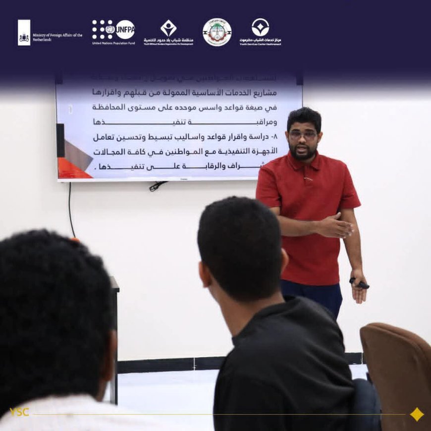 اختتم مركز خدمات الشباب حضرموت برنامج "الحكم المحلي والمشاركة السياسية للشباب"، ضمن مشروع "دعم برامج الشباب"، الذي تنفذه منظمة شباب بلا حدود للتنمية بالشراكة مع جامعة حضرموت وبتمويل من صندوق الأمم المتحدة للسكان (UNFPA).
