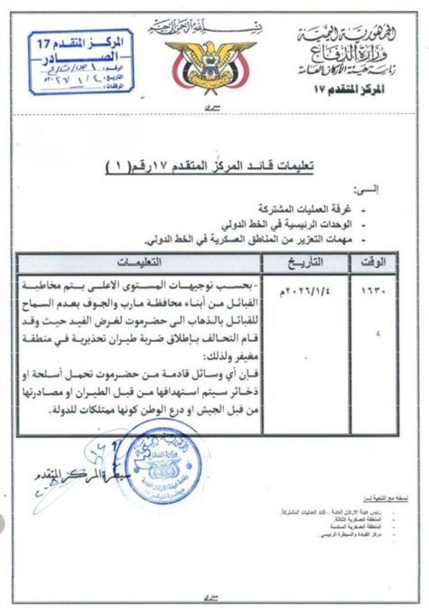 كشف مراسل وكالة "شينخوا" الصينية، الصحفي فارس الحميري، عن وثيقة رسمية صادرة عن وزارة الدفاع اليمنية (رئاسة هيئة الأركان العامة - المركز المتقدم 17)، تتضمن توجيهات عسكرية صارمة بمنع تحرك قبائل من مأرب والجوف باتجاه محافظة حضرموت لغرض "الفيد" أو النهب.