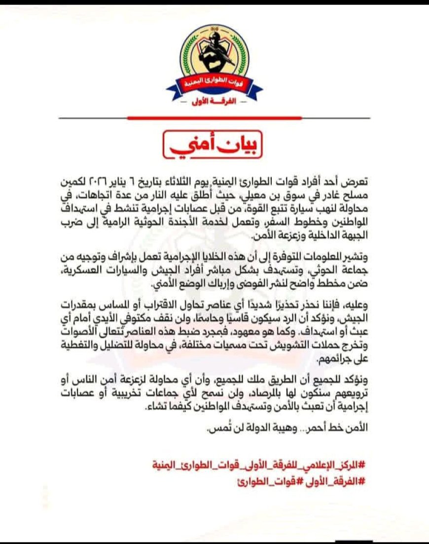 أعلنت قوات الطوارئ اليمنية (الفرقة الأولى) عن تعرض أحد أفرادها لكمين مسلح غادر يوم الثلاثاء الماضي، 6 يناير 2026، في منطقة "سوق بن معيلي"، واصفة الحادث بأنه جزء من مخطط تخريبي يهدف إلى زعزعة الاستقرار وخدمة أجندات معادية.