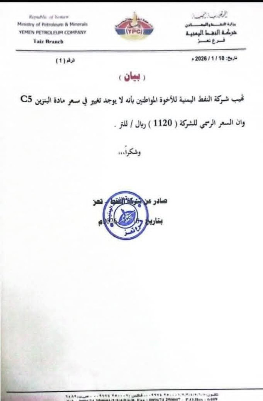 أصدرت شركة النفط اليمنية - فرع تعز، الليلة، بياناً توضيحياً (رقم 1) لطمأنة الأخوة المواطنين بشأن استقرار أسعار المشتقات النفطية في المحافظة.