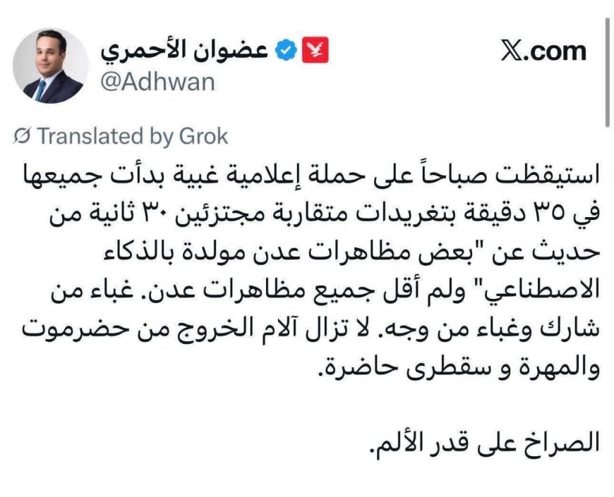 وأوضح الأحمري أن حديثه عن استخدام "الذكاء الاصطناعي" في تظاهرات عدن كان مجتزأً.. مشيراً إلى أنه قصد "بعض" المظاهرات وليس جميعها.