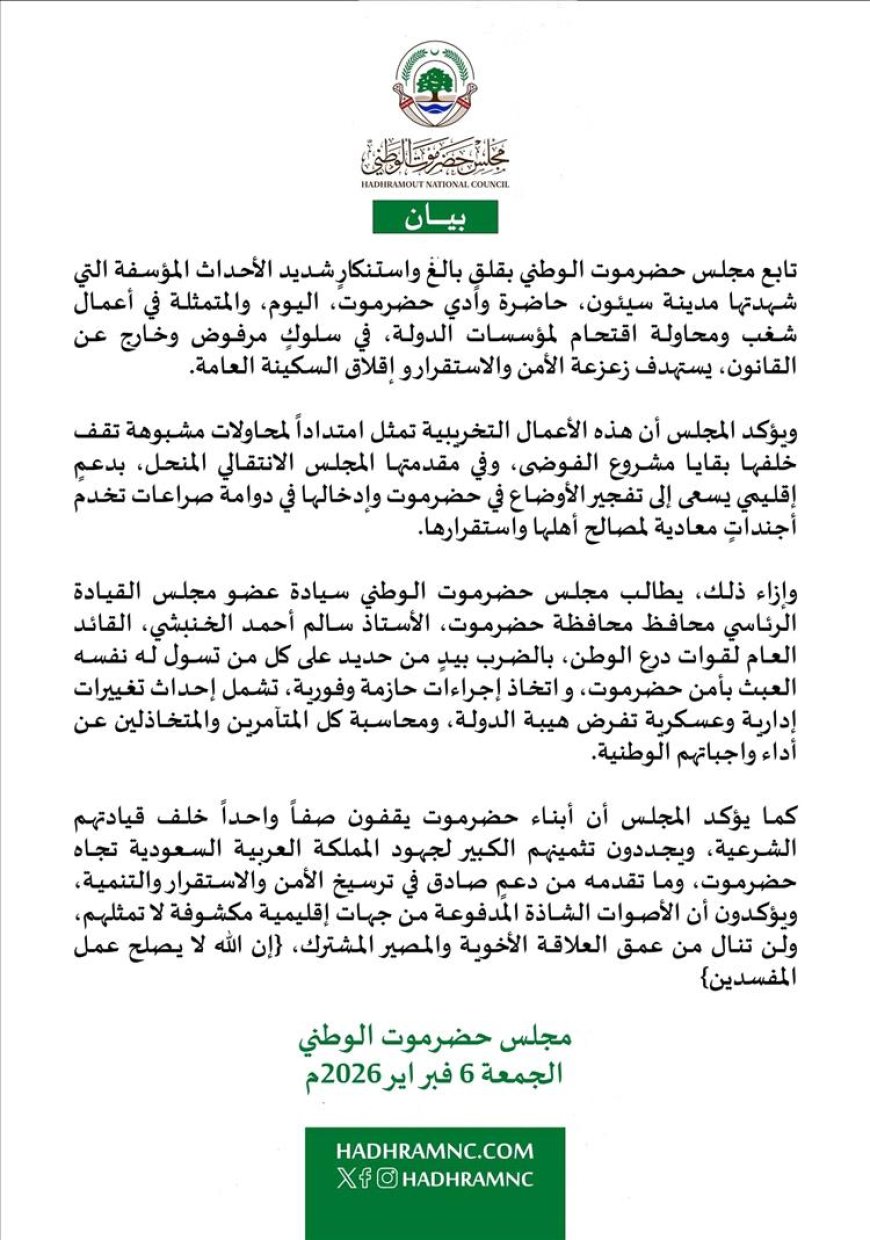 واختتم المجلس بيانه بالتأكيد على أن أبناء حضرموت يقفون صفاً واحداً خلف القيادة الشرعية، مثمناً الدعم الاستراتيجي الذي تقدمه المملكة العربية السعودية لترسيخ الأمن والتنمية، ومعتبراً أن الأصوات التي تحاول شق الصف لا تمثل الهوية الحضرمية ولا تنال من عمق العلاقة الأخوية والمصير المشترك مع الجوار.