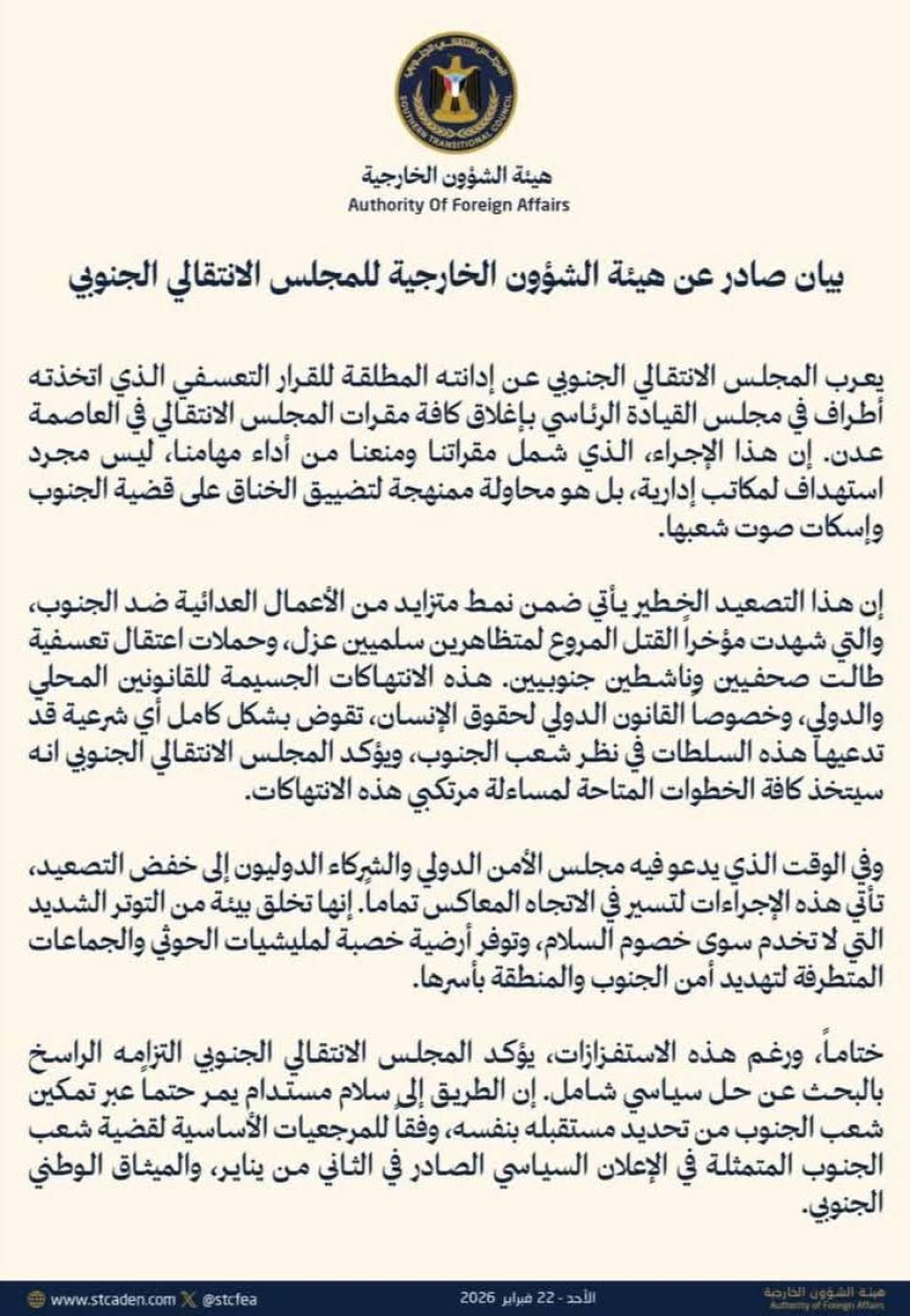 وجاء في بيان صادر عن هيئة الشؤون الخارجية للمجلس الانتقالي الجنوبي: "يعرب المجلس الانتقالي الجنوبي عن إدانته المطلقة للقرار التعسفي الذي اتخذته أطراف في مجلس القيادة الرئاسي بإغلاق كافة مقرات المجلس الانتقالي في العاصمة عدن".