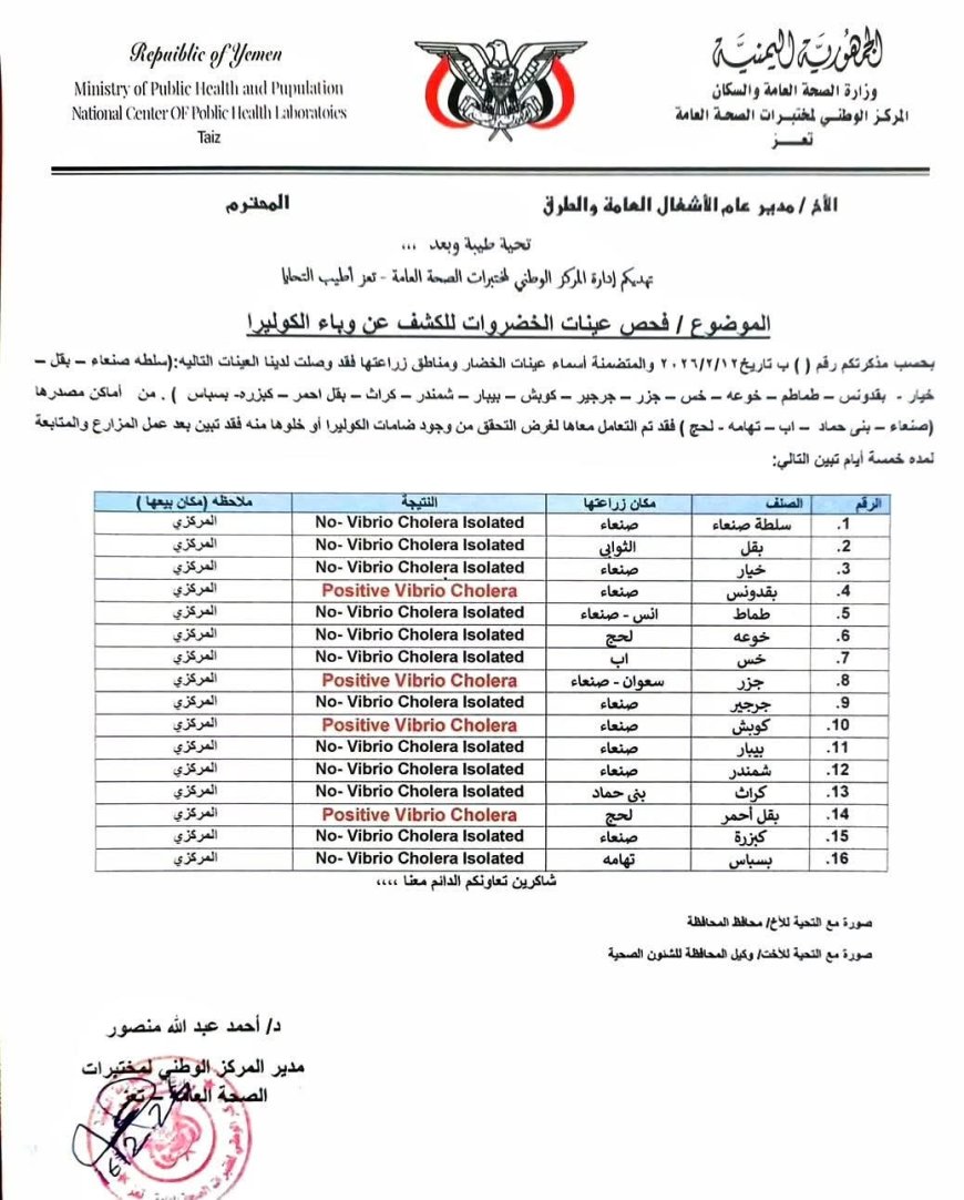 تحذير صحي عاجل وخطير!!.. رصد بكتيريا الكوليرا في (4) أنواع من الخضروات في الأسواق (وثيقة)