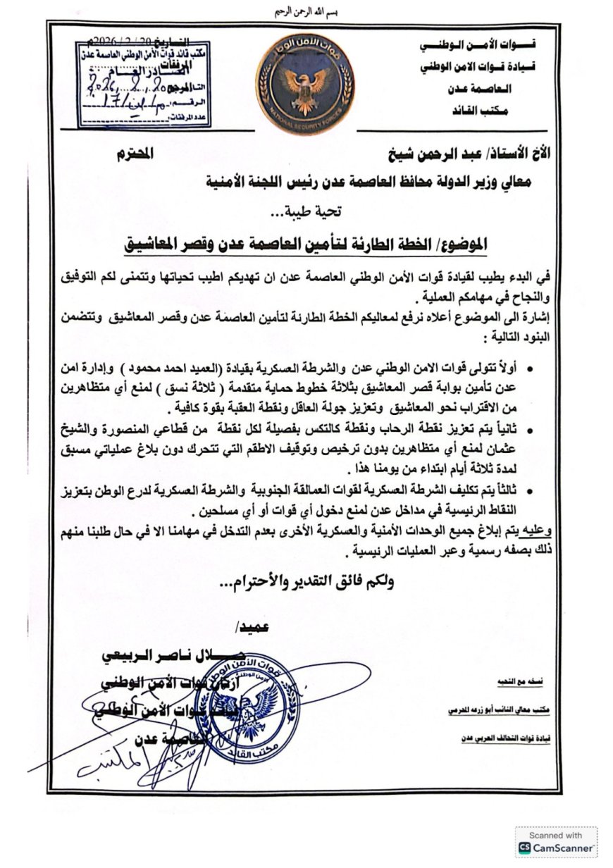 كشفت وثيقة رسمية مسربة صادرة عن قيادة قوات الأمن الوطني بالعاصمة عدن، بتاريخ 20 فبراير 2026م، عن اعتماد "خطة طارئة" شاملة لتأمين العاصمة وحماية قصر المعاشيق، تضمنت بنوداً أمنية وعسكرية صارمة تهدف إلى تعزيز الاستقرار ومنع أي اختراقات ميدانية.