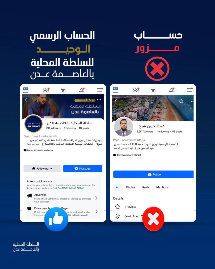 بناءً على التعميم الصادر عن وكيل العاصمة عدن لقطاع الإعلام، الأستاذ محمد سعيد سالم، في 8 يناير 2026م، نؤكد أن المصدر الرسمي والوحيد المعتمد لتمثيل السلطة المحلية على منصات التواصل الاجتماعي هو الحساب التالي على منصة فيسبوك: السلطة المحلية بالعاصمة عدن (@AdenGov).