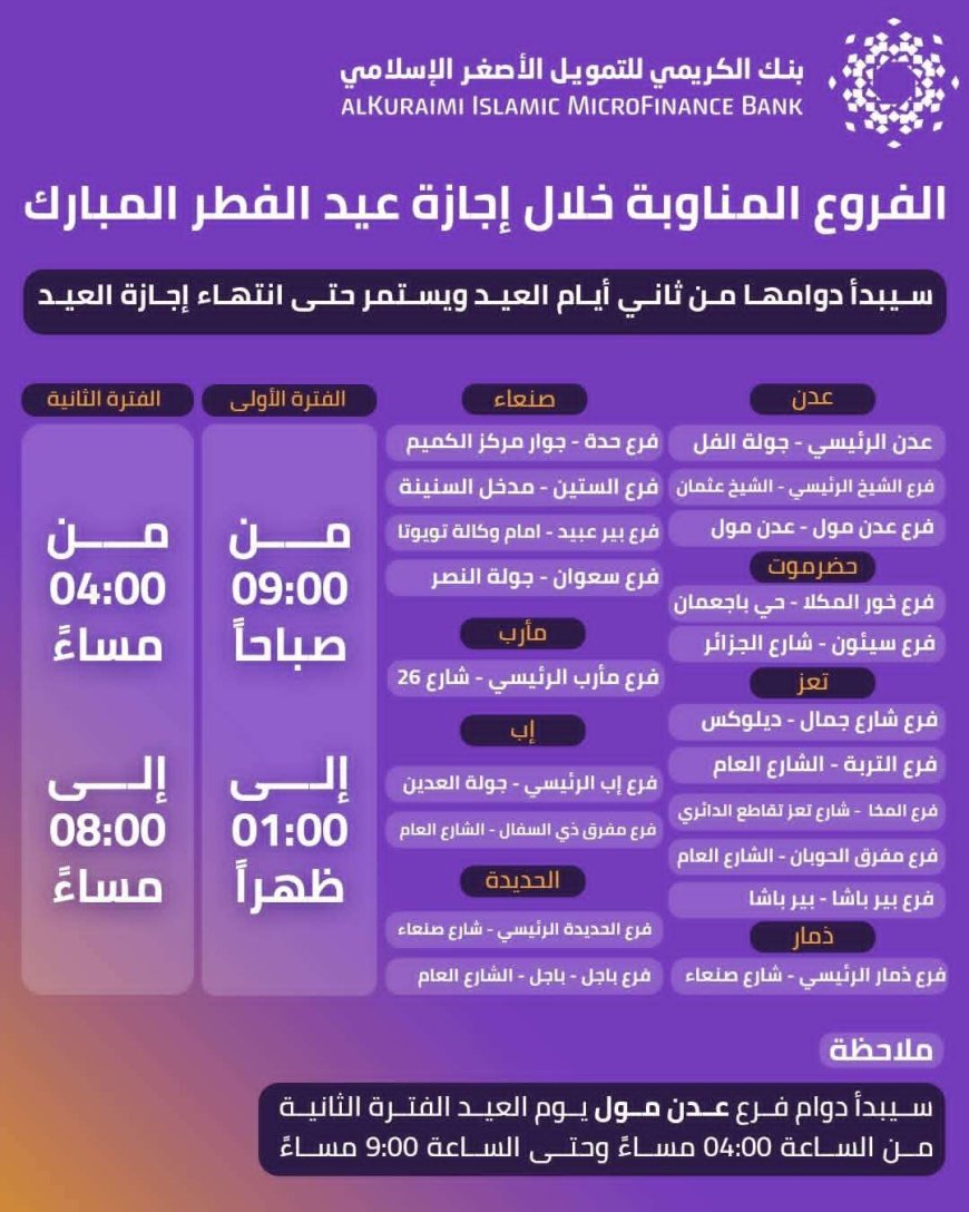 بنك الكريمي يعلن استمرار خدماته خلال إجازة عيد الفطر عبر فروع مناوبة في عدن وصنعاء وتعز وحضرموت، مع تحديد فترات الدوام الصباحية والمسائية.