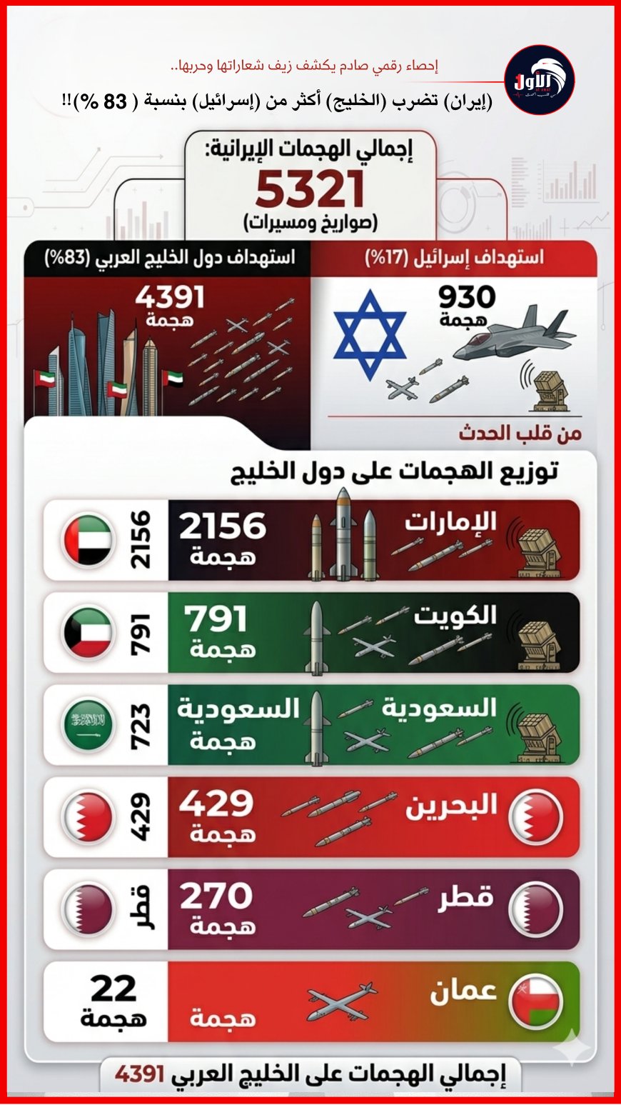 إحصاء حديث يصدم الجميع بأن 83% من الهجمات الإيرانية بالصواريخ والمسيرات منذ فبراير استهدفت دول الخليج (4391 هجوماً) مقابل 17% لإسرائيل، وسط إدانة أممية وتحذيرات سعودية.