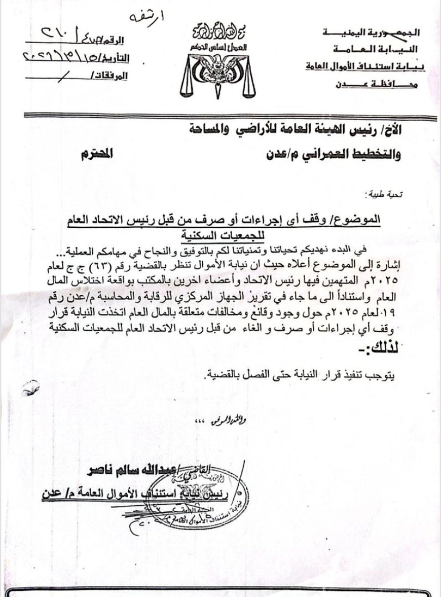 وبناءً على ذلك، وجه رئيس نيابة استئناف الأموال العامة بعدن الأخ رئيس الهيئة العامة للأراضي والمساحة والتخطيط العمراني - عدن، بإيقاف أي إجراءات أو صرف من قبل رئيس الاتحاد العام للجمعيات السكنية.