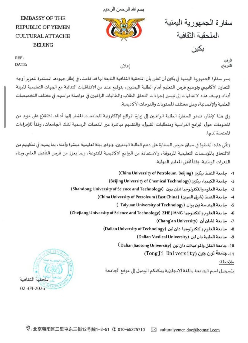 دعت الملحقية الثقافية بجمهورية الصين الشعبية (بكين) الطلاب اليمنيين الراغبين بالدراسة في الجامعات الصينية إلى الإستفادة من الاتفاقيات الثنائية التي وقعتها الملحقية مع (11) جامعة صينية مرموقة.