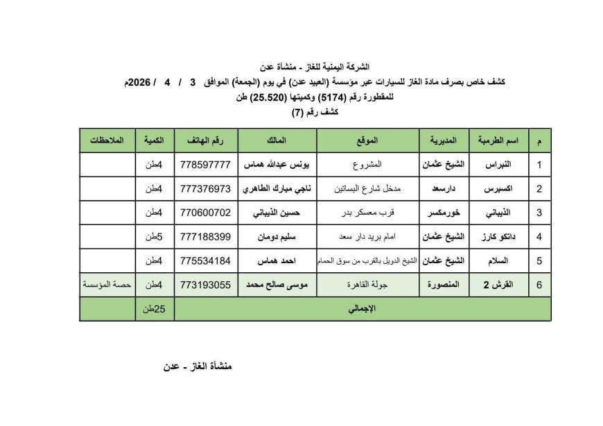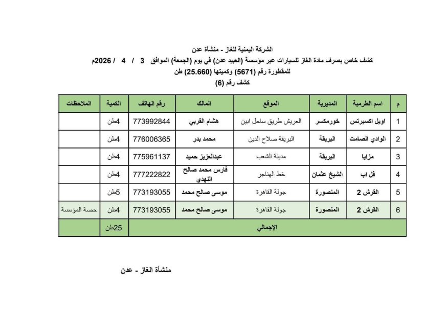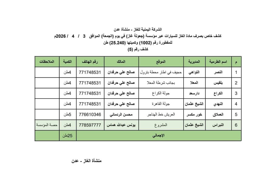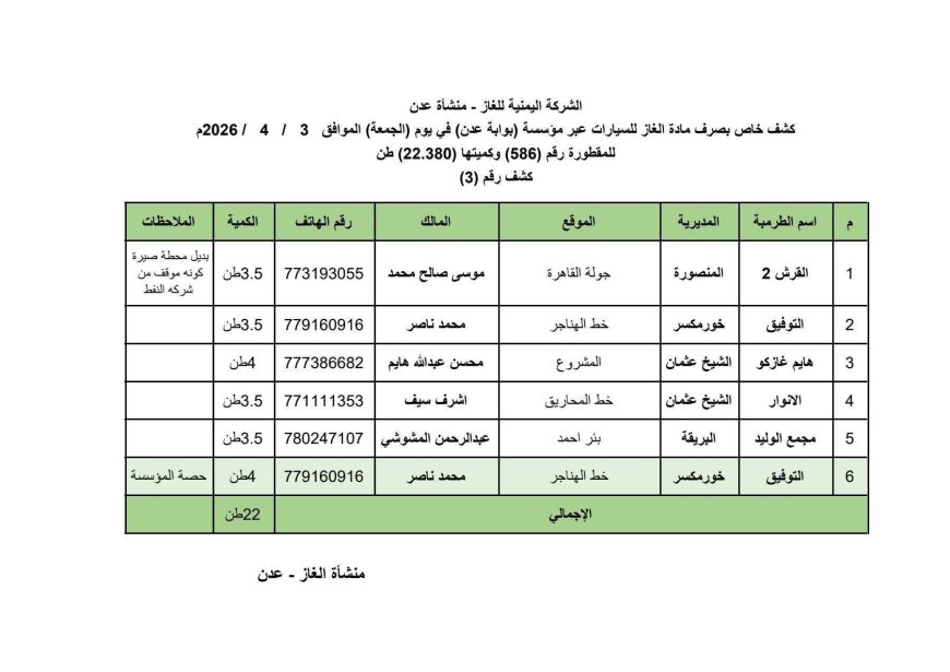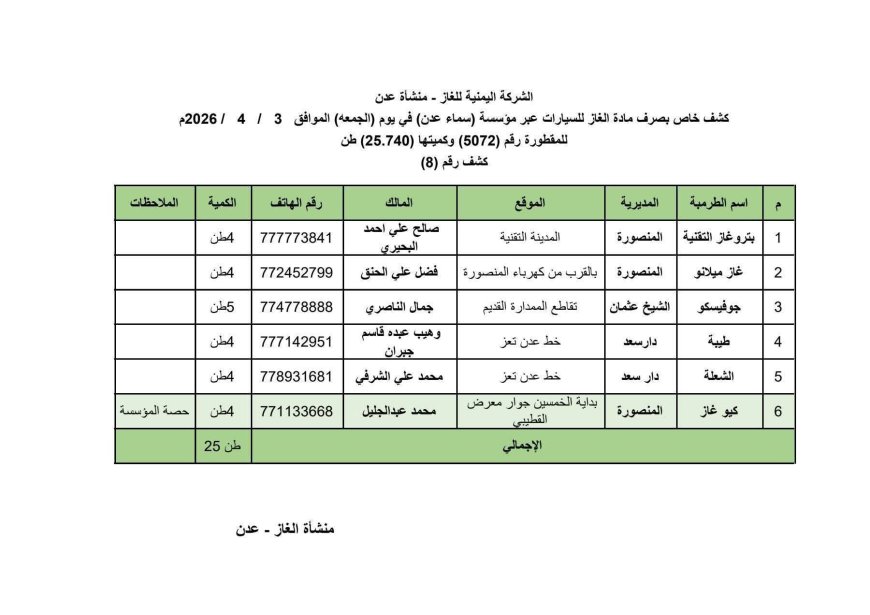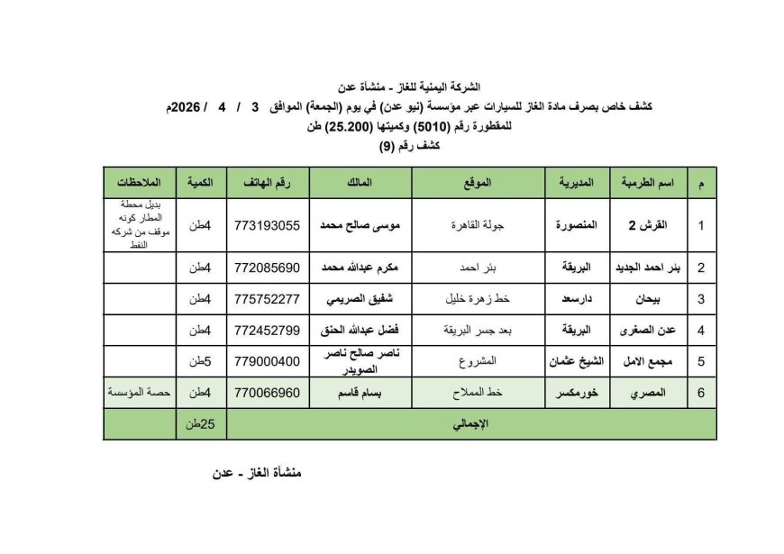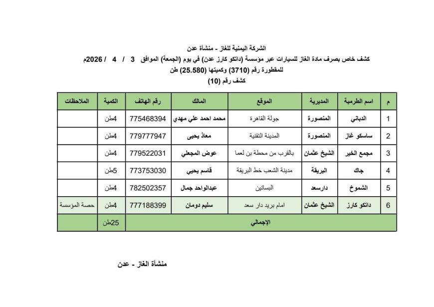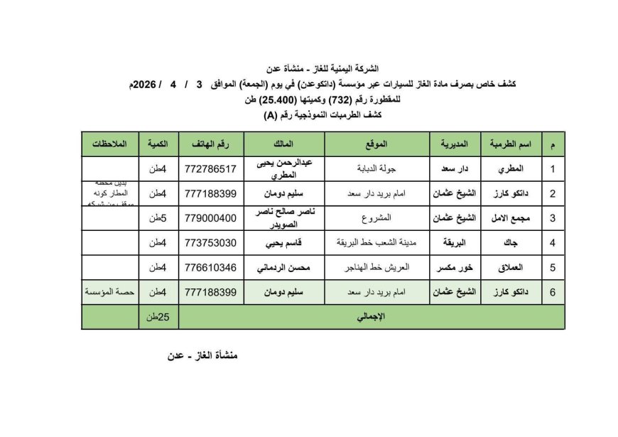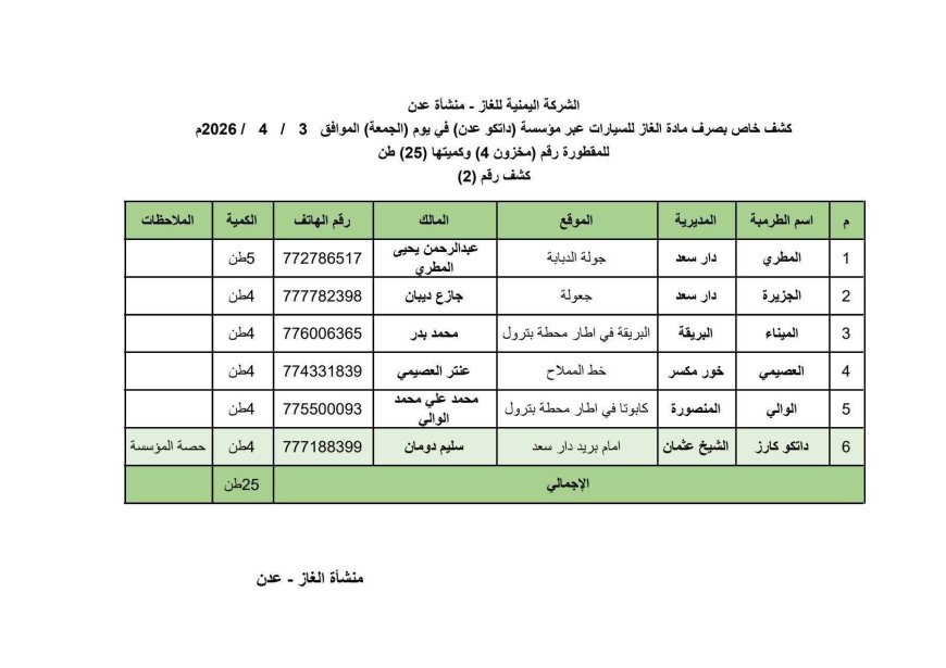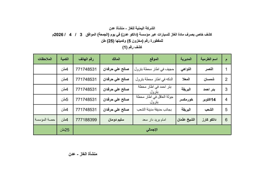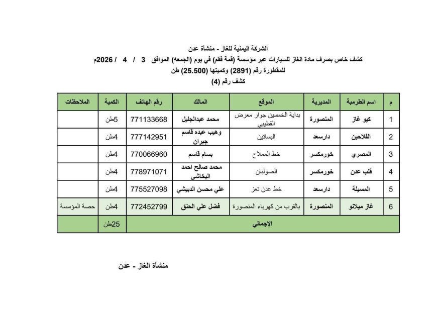 بحسب الكشوفات الرسمية الصادرة عن الشركة اليمنية للغاز - منشأة عدن، فقد تم توزيع مقطورات الغاز عبر عدة مؤسسات (داتكو كارز، قمة فقم، جولة غاز، وغيرها) لتشمل كافة المديريات. وفيما يلي رصد لأبرز المحطات التي تسلمت حصصها: