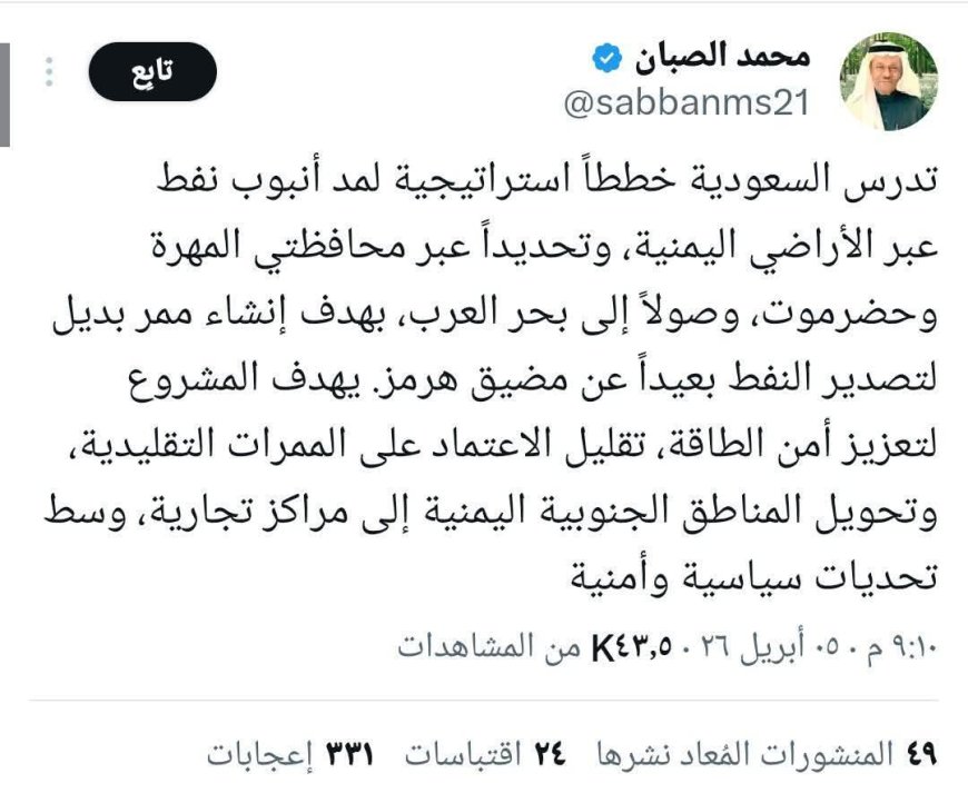 كشف الخبير النفطي محمد الصبان اليوم الاثنين 6 أبريل 2026 عن خطة سعودية لمد أنبوب نفط عبر حضرموت والمهرة إلى بحر العرب، لتأمين بديل استراتيجي عن مضيق هرمز وتحويل جنوب اليمن لمركز تجاري عالمي