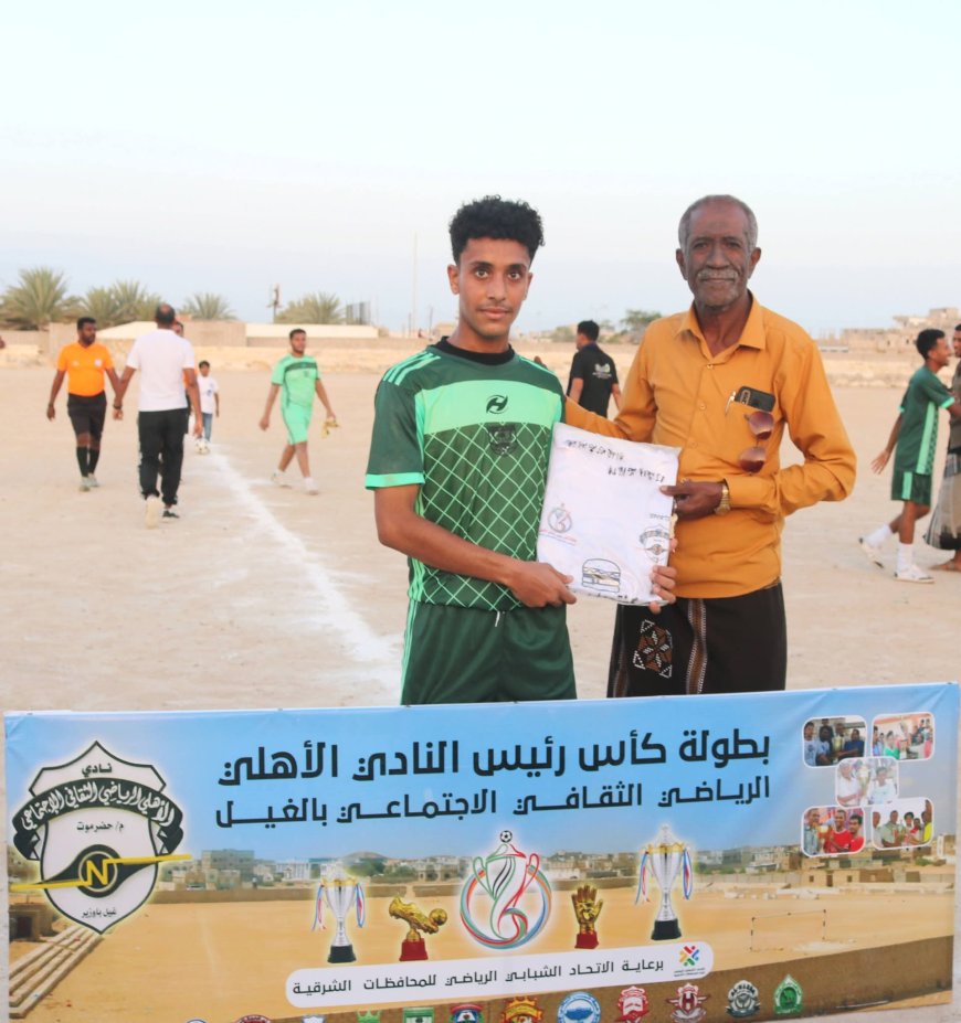 تحصل على جائزة أفضل لاعب في المباراة لاعب فريق شباب النقعة أحمد عبدالله بارهيان، تسلمها من الشخصية الرياضية محمد عوض بن وبر، الجائزة مقدمة كافتيريا برمة للوجبات السريعة.
