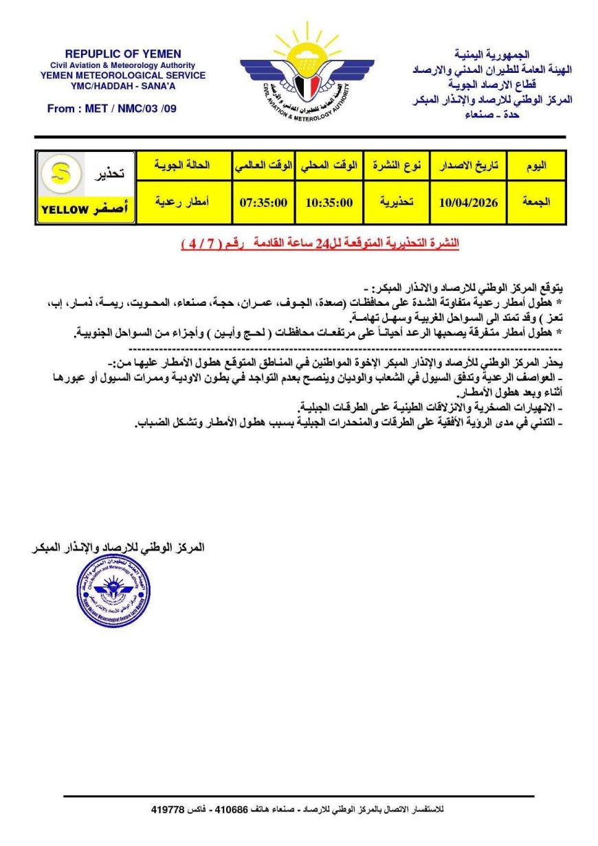 حذر مركز الأرصاد من هطول أمطار رعدية متفاوتة الشدة على صنعاء وتعز وإب وعدد من المحافظات، داعياً المواطنين لتجنب مجاري السيول والحذر من الانهيارات الصخرية.