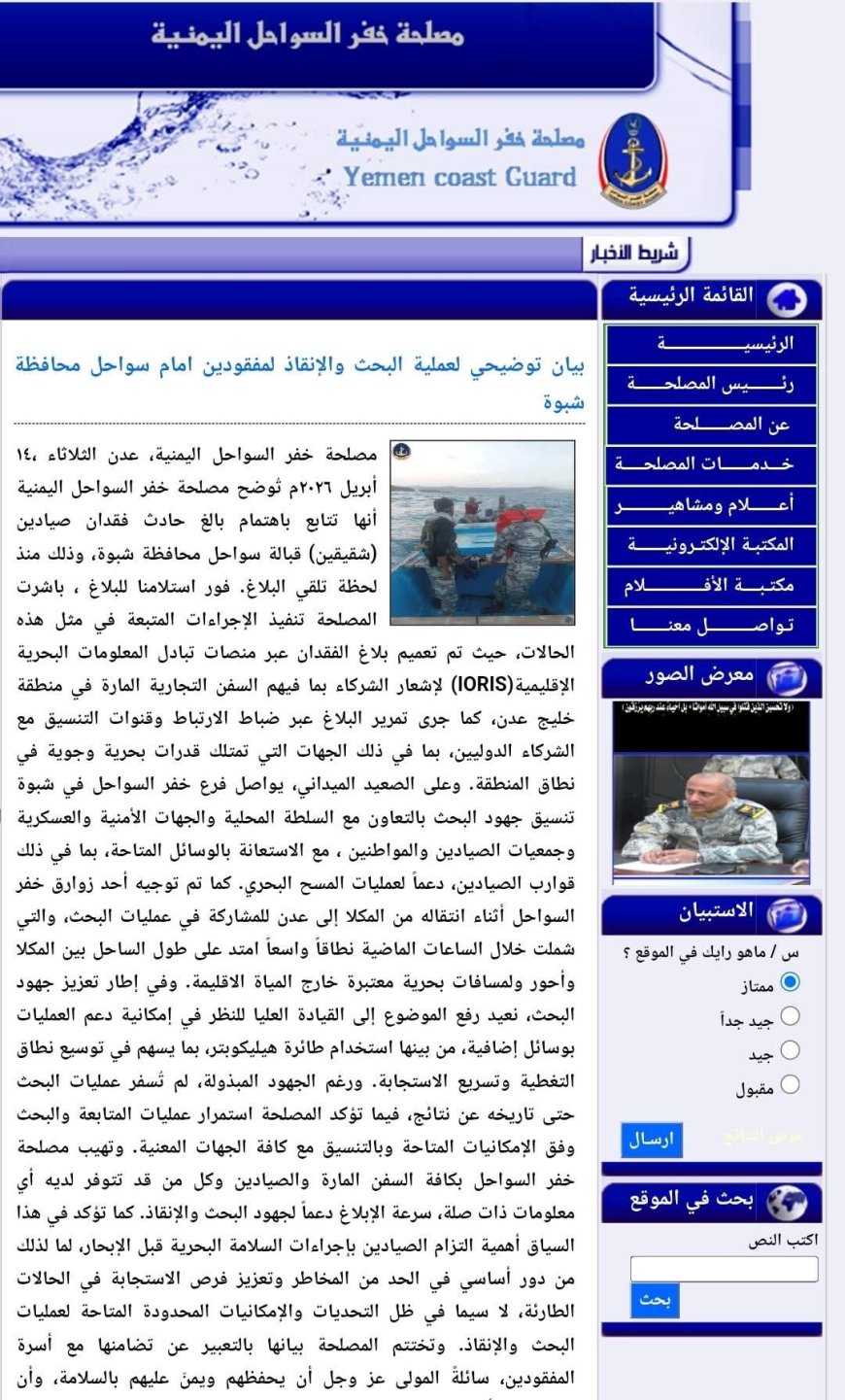 تُوضح مصلحة خفر السواحل اليمنية أنها تتابع باهتمام بالغ حادث فقدان صيادين (شقيقين) قبالة سواحل محافظة شبوة، وذلك منذ لحظة تلقي البلاغ.