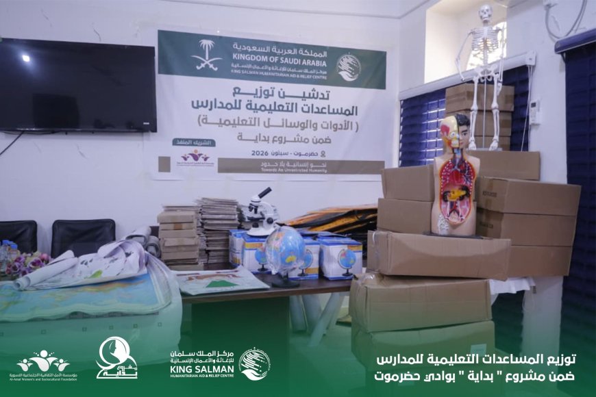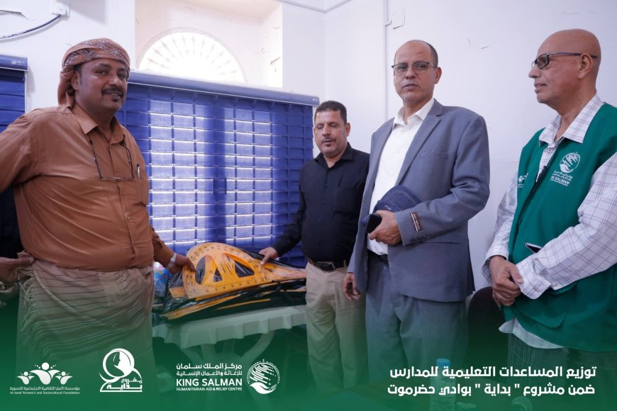 بتمويل مركز الملك سلمان للإغاثة والأعمال الإنسانية توزيع المساعدات التعليمية للمدارس ضمن مشروع " بداية " بوادي حضرموت