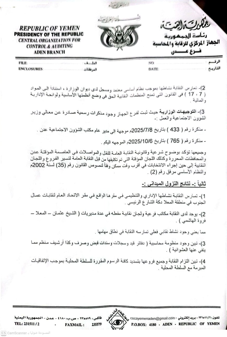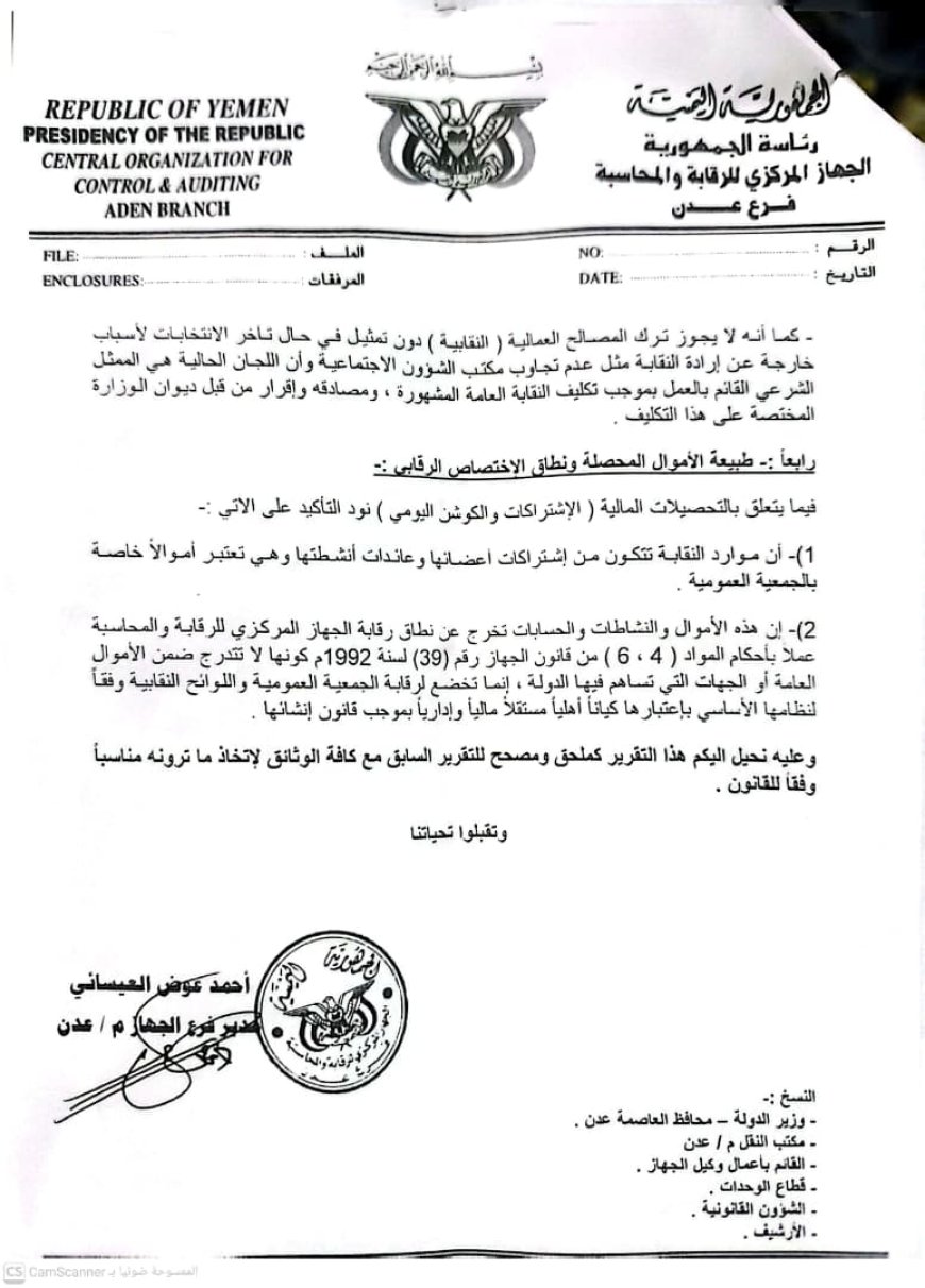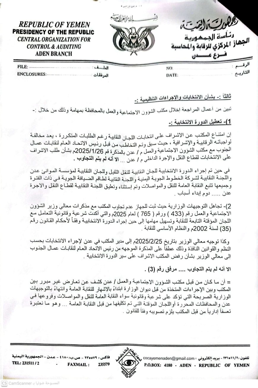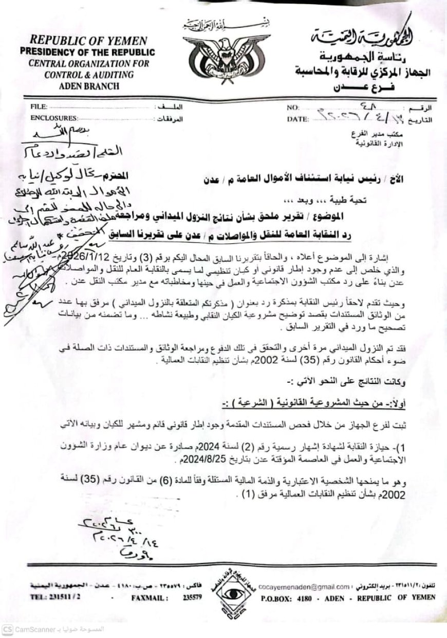 فجر تقرير ملحق صادر عن فرع الجهاز المركزي للرقابة والمحاسبة بعدن، اليوم، مفاجأة قانونية ثقيلة قلبت موازين القضية المثارة ضد النقابة العامة للنقل والمواصلات، حيث أكد التقرير (المؤرخ في 13 أبريل 2026) شرعية وقانونية النقابة، مصححاً كافة الاستنتاجات الخاطئة التي وردت في تقرير سابق مطلع العام الجاري.