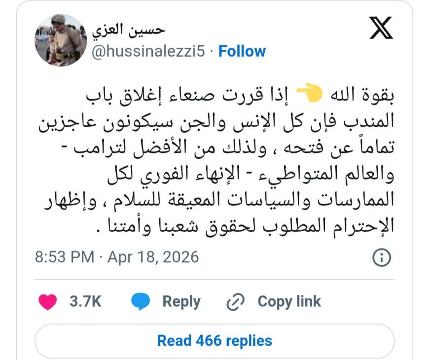 وقال القيادى فى جماعة الحوثيون باليمن، حسين العزى، إنه إذا قررت صنعاء إغلاق باب المندب فإن كل الإنس والجن سيكونوا عاجزين تمامًا عن فتحه.