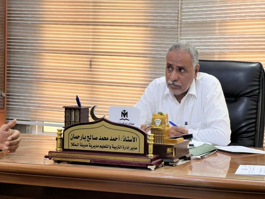 التقى الأستاذ/ أحمد محمد بارحمان مدير إدارة التربية والتعليم بمديرية مدينة المكلا، صباح اليوم الأحد الموافق 19 إبريل في مكتبه بالإدارة، ممثلي مؤسسة مواهب، ممثلة بالأخ/ طارق صالح باجبير مدير معهد حضرموت للموهوبين، والأخ/ يعقوب عاشور مدير إدارة الموارد البشرية بمؤسسة مواهب، وذلك بحضور نائب المدير الأستاذ/ خالد عبدالله باعطية رئيس قسم التعليم العام ، لمناقشة تنفيذ الحملة الاستكشافية للطلاب الموهوبين من خريجي الصف التاسع للعام الدراسي 2025–2026م.