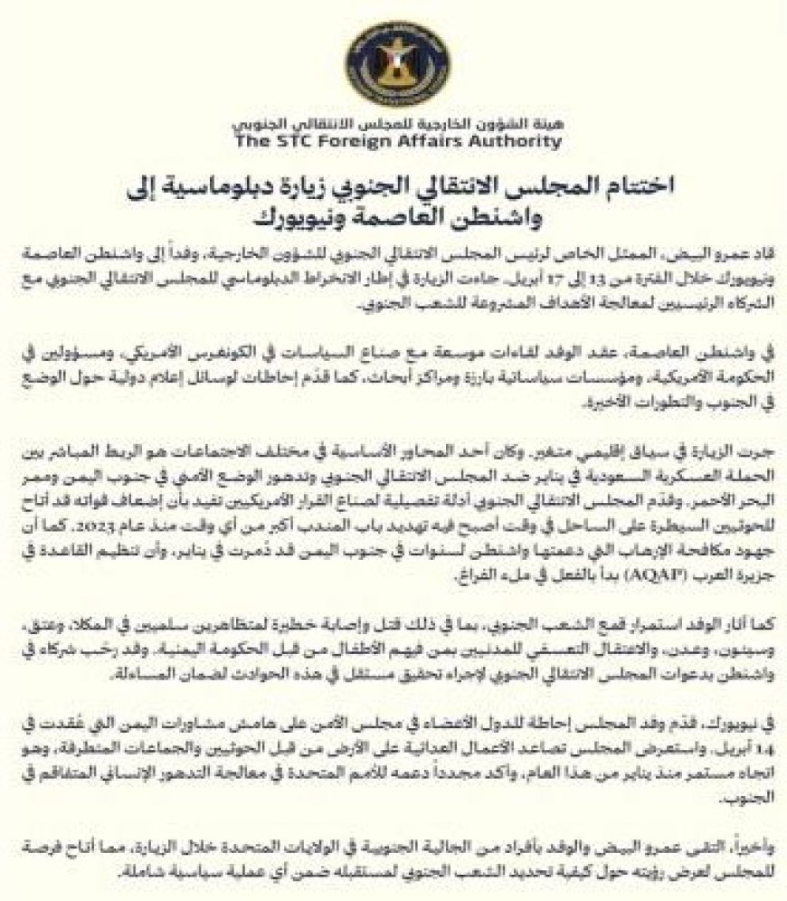 أصدرت هيئة الشؤون الخارجية للمجلس الانتقالي الجنوبي، بياناً سياسياً هاماً كشفت فيه عن نتائج الجولة الدبلوماسية المكثفة التي قام بها وفد المجلس برئاسة الممثل الخاص للشؤون الخارجية عمرو البيض، إلى العاصمتين السياسيتين واشنطن ونيويورك خلال الفترة من 13 إلى 17 أبريل الجاري.