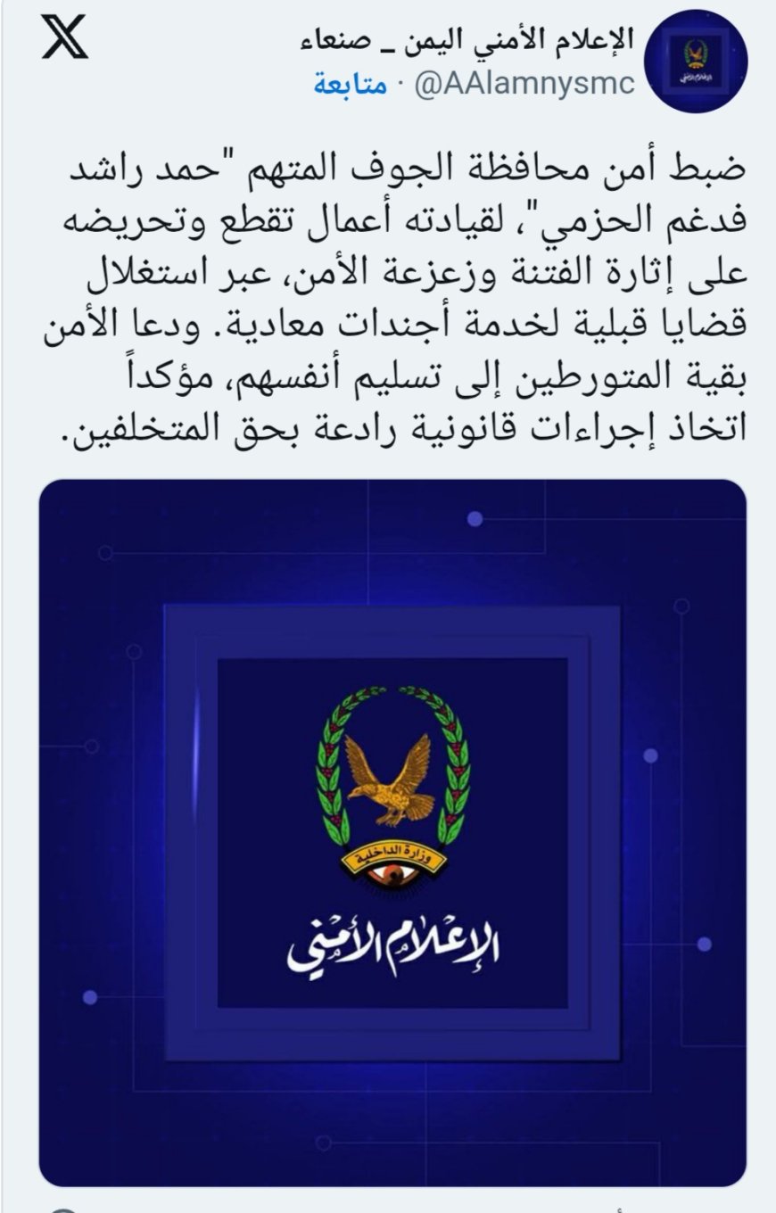 في المقابل، أصدر الإعلام الأمني التابع للحوثيين، بيانًا عبر حسابه الرسمي على منصة "إكس"، كال من خلاله جملة من الاتهامات بحق الشيخ الحزمي، جاء فيه: "ضبط أمن محافظة الجوف المتهم (الحزمي)، لتحريضه على إثارة الفتنة وزعزعة الأمن، عبر استغلال قضايا قبلية لخدمة أجندات معادية".