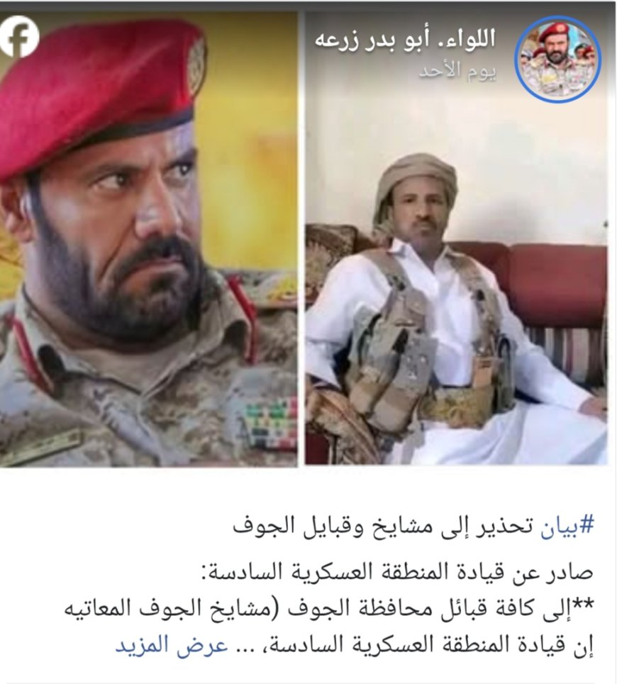 وفي بيان سابق، للقيادي نفسه والمُكنى بـ"أبو بدر زرعة"، نعت من خلاله كافة مشايخ وقبائل الجوف بالـ"معاتيه"، مُشيرًا في الوقت ذاته، إلى أن "زمن المتاجرة بالقضايا القبلية تحت مسمى (النكف) قد ولّى ودُفن"، مواصلًا استخدام لغة ساخرة، بوصف مشايخ الجوف بـ"مشايخ المرق"، محذّرًا إيّاهم بأن قواته "ستسلخ جلودهم"، ملوحًا بأنه "لن يتم التهاون أو التردد في سحق أي تحرك عسكري".