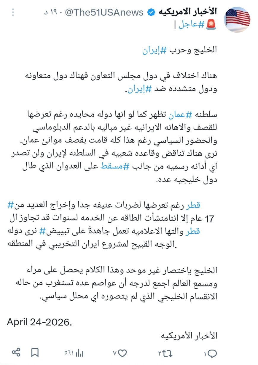 عاجل عن مصادر إعلامية أمريكية: الخليج منقسم في حرب إيران.. عُمان تلتزم الصمت رغم القصف وقطر تبيّض وجه طهران رغم تدمير منشآتها