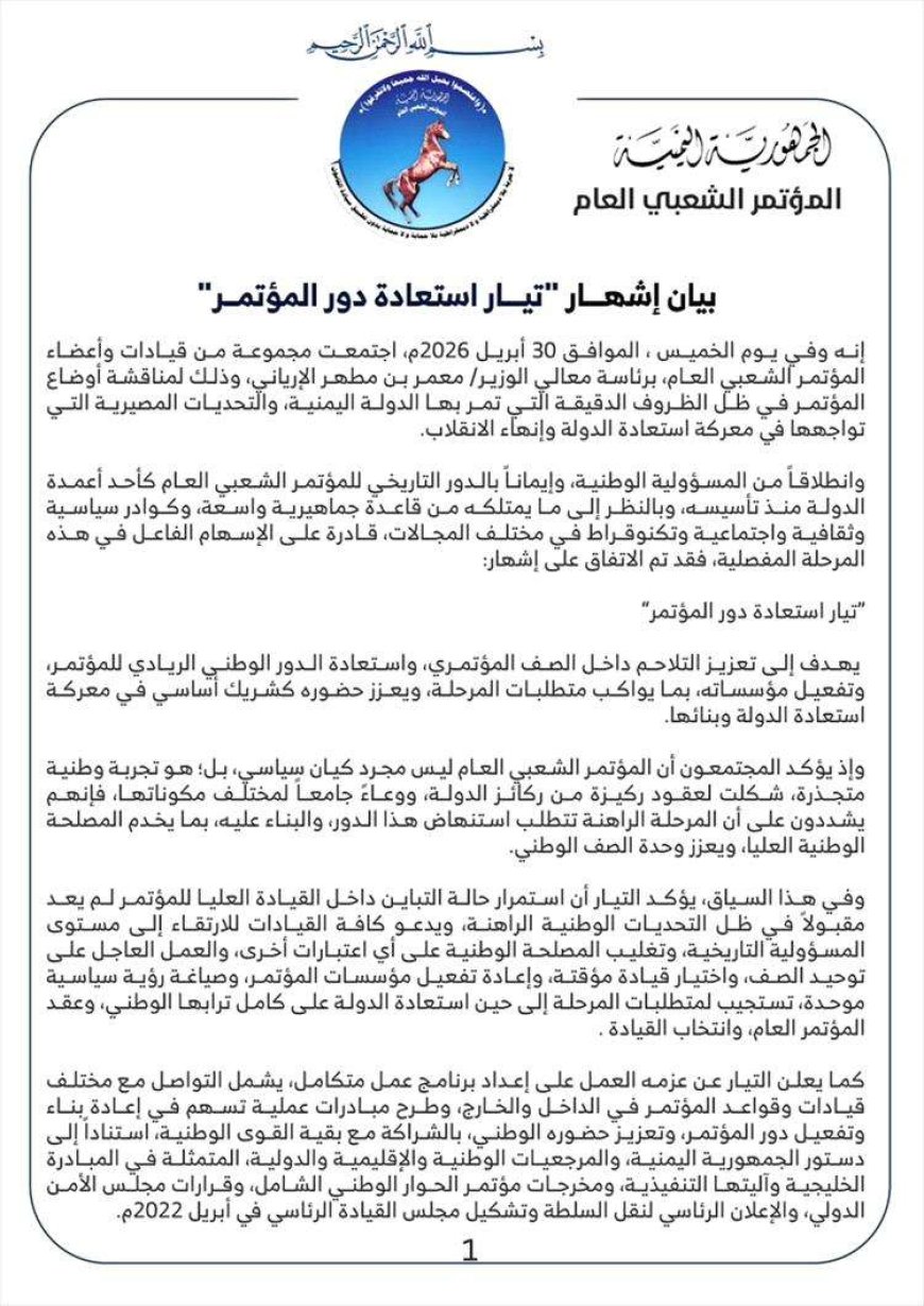 أُعلن اليوم الخميس، في خطوة هي الأولى من نوعها منذ اغتيال مؤسس الحزب الرئيس الراحل علي عبدالله صالح، عن إشهار "تيار استعادة دور المؤتمر" برئاسة وزير الإعلام الأستاذ معمر بن مطهر الإرياني، وذلك في ختام اجتماع موسع ضم كوكبة من قيادات وأعضاء المؤتمر الشعبي العام من مختلف التوجهات.
